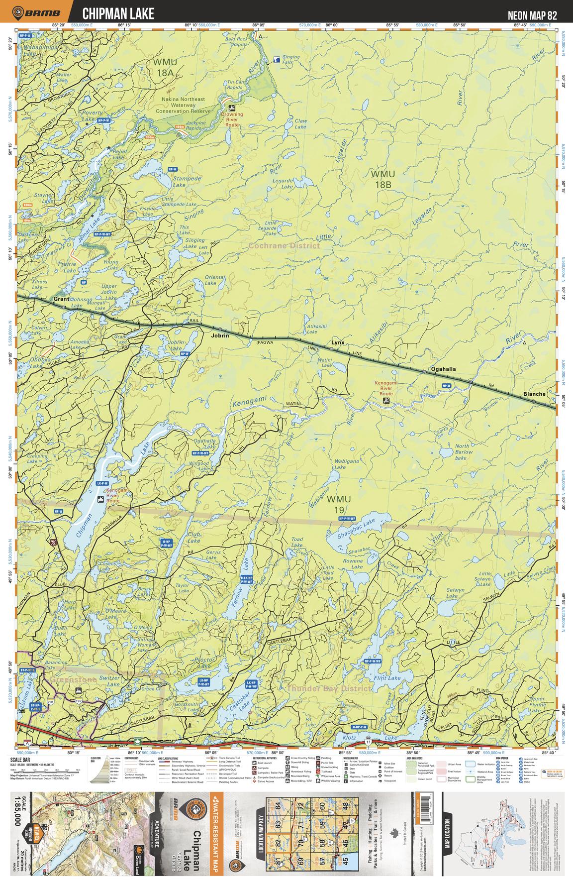 This recreation topographic map for Chipman Lake highlights all the logging/resource roads, hunting areas, fishing lakes & streams, campsites, paddling routes for canoeing and kayaking, wildlife viewing areas, multi-use trails for hiking, biking, horseback riding, cross-country skiing and snowshoeing, motorized trails for ATVing and snowmobiling & more. Covering 3,040 km2 (1,170 mi2), this 1:85,000 scale map measures 48 x 63.5 km (30 x 39.5 mi), providing you with more topographic and recreational detail for the Meldrum Bay area than any other map on the market. New features include Crown land areas, countless new roads and trails plus additional recreational Points of Interest. Included on this map are Chipman Lake, Shacabac Lake, Kenogami River, Fernow Lake, Flint Lake, Klotz Lake, Buell Lake and more!