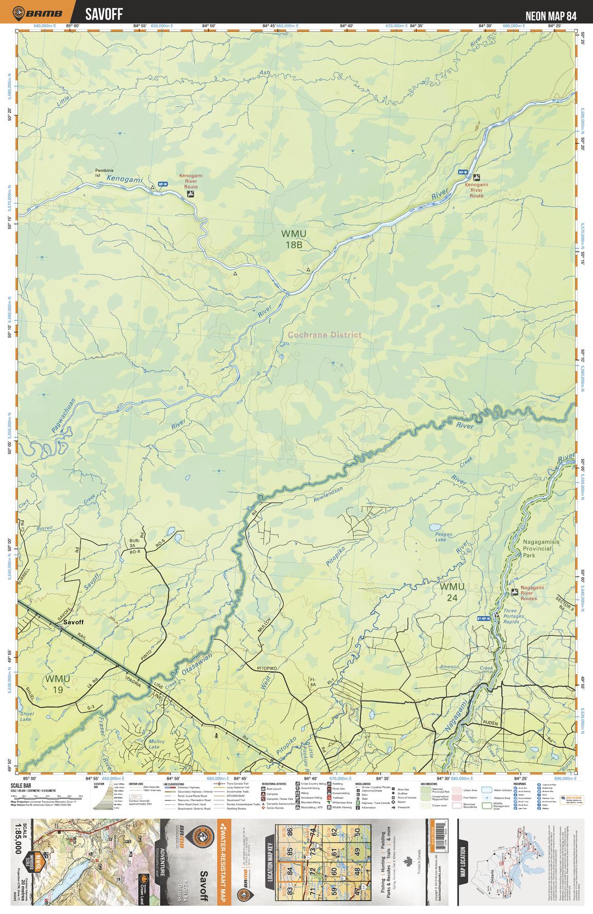 This recreation topographic map for Savoff highlights all the logging/resource roads, hunting areas, fishing lakes & streams, campsites, paddling routes for canoeing and kayaking, wildlife viewing areas, multi-use trails for hiking, biking, horseback riding, cross-country skiing and snowshoeing, motorized trails for ATVing and snowmobiling & more. Covering 3,040 km2 (1,170 mi2), this 1:85,000 scale map measures 48 x 63.5 km (30 x 39.5 mi), providing you with more topographic and recreational detail for the Meldrum Bay area than any other map on the market. New features include Crown land areas, countless new roads and trails plus additional recreational Points of Interest. Included on this map are Savoff, Kenogami River, Otasawian River, Pagwachuan River, Nagagamisis Provincial Park and more!