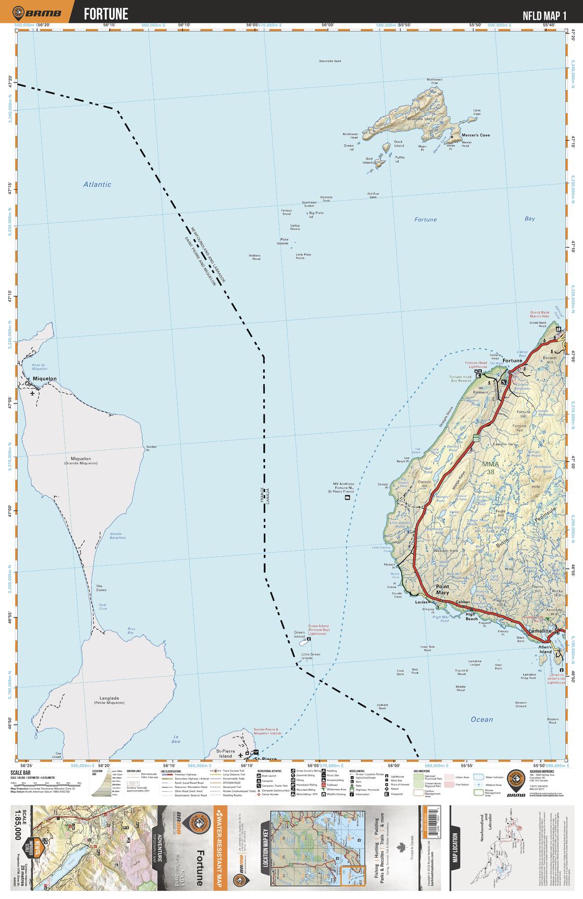 This recreation topographic map for Fortune highlights all the logging/resource roads, hunting areas, fishing lakes & streams, campsites, paddling routes for canoeing and kayaking, wildlife viewing areas, multi-use trails for hiking, biking, horseback riding, cross-country skiing and snowshoeing, motorized trails for ATVing and snowmobiling & more. Covering 3,040 km2 (1,170 mi2), this 1:85,000 scale map measures 48 x 63.5 km (30 x 39.5 mi), providing you with more topographic and recreational detail for the Fortune area than any other map on the market. Special features include countless roads, trails and recreational Points of Interest. Included on this map are Allan’s Island, Brunette Island, Burin Peninsula, Calmer, Fortune, Fortune Head Lighthouse, Green Island, High Beach, Lamaline, Mercer’s Cove and Point Mary, plus the French islands of Sainte-Pierre and Miquelon.