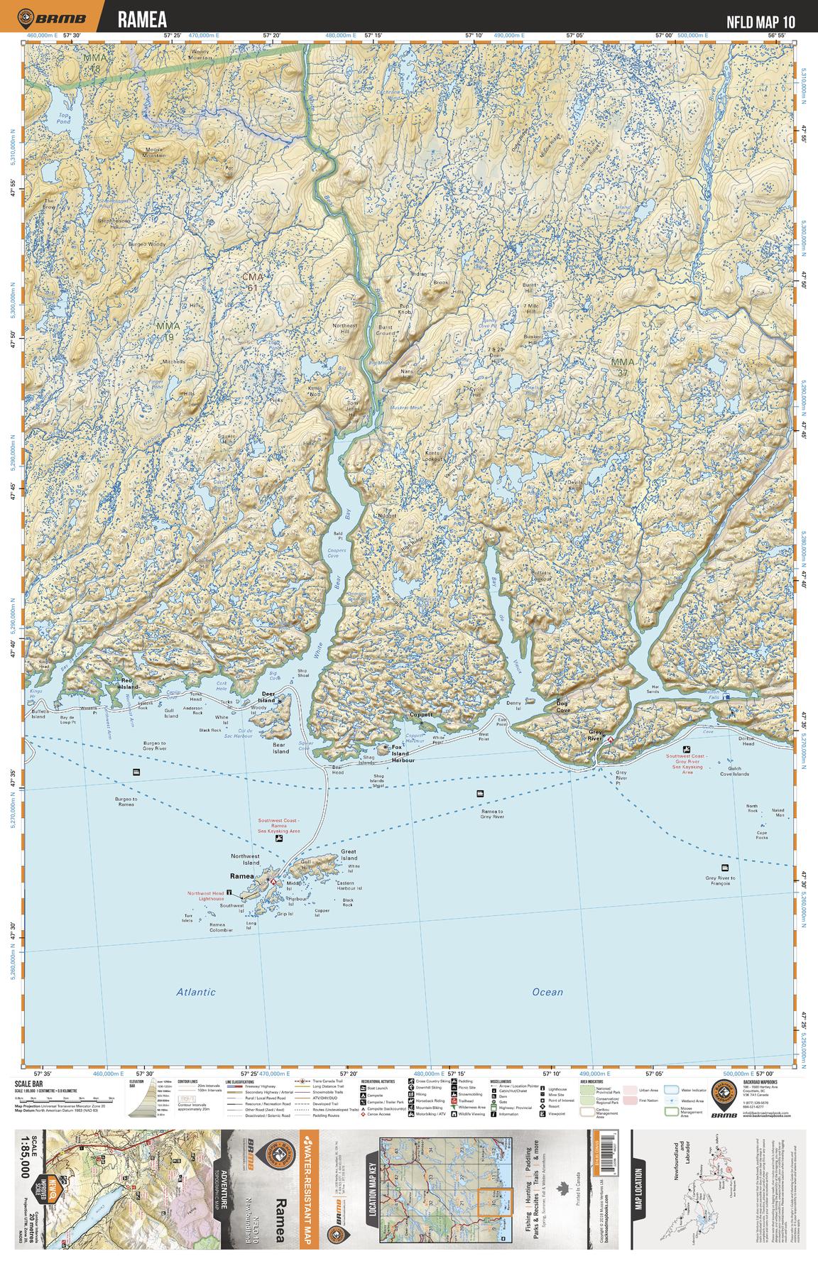 This recreation topographic map for Ramea highlights all the logging/resource roads, hunting areas, fishing lakes & streams, campsites, paddling routes for canoeing and kayaking, wildlife viewing areas, multi-use trails for hiking, biking, horseback riding, cross-country skiing and snowshoeing, motorized trails for ATVing and snowmobiling & more. Covering 3,040 km2 (1,170 mi2), this 1:85,000 scale map measures 48 x 63.5 km (30 x 39.5 mi), providing you with more topographic and recreational detail for the Fortune area than any other map on the market. Special features include countless roads, trails and recreational Points of Interest. Included on this map are Ramea, White Bear Bay, White Bear River, Grey River, Bay de Vieux, Top Pond and more!