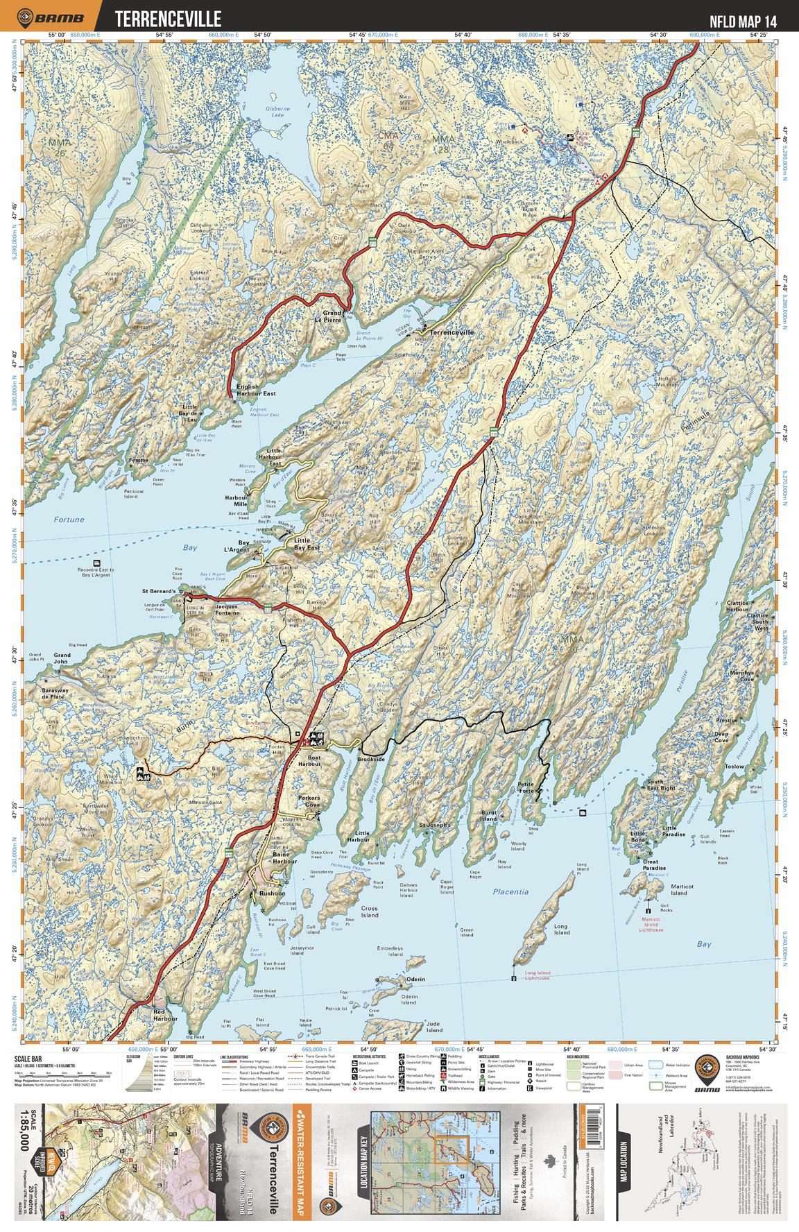 This recreation topographic map for Terrenceville highlights all the logging/resource roads, hunting areas, fishing lakes & streams, campsites, paddling routes for canoeing and kayaking, wildlife viewing areas, multi-use trails for hiking, biking, horseback riding, cross-country skiing and snowshoeing, motorized trails for ATVing and snowmobiling & more. Covering 3,040 km2 (1,170 mi2), this 1:85,000 scale map measures 48 x 63.5 km (30 x 39.5 mi), providing you with more topographic and recreational detail for the Fortune area than any other map on the market. Special features include countless roads, trails and recreational Points of Interest. Included on this map are Terrenceville, Fortune Bay, Placentia Bay, Paradise Sound, Long Harbour, Gisborne Lake and more!