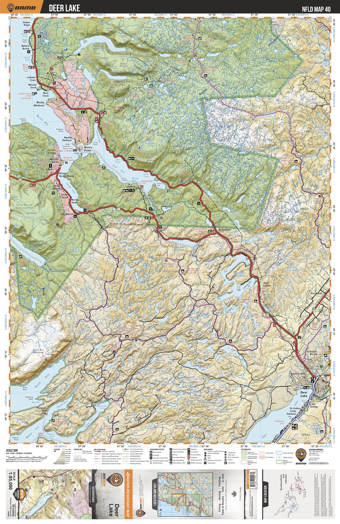This recreation topographic map for Deer Lake highlights all the logging/resource roads, hunting areas, fishing lakes & streams, campsites, paddling routes for canoeing and kayaking, wildlife viewing areas, multi-use trails for hiking, biking, horseback riding, cross-country skiing and snowshoeing, motorized trails for ATVing and snowmobiling & more. Covering 3,040 km2 (1,170 mi2), this 1:85,000 scale map measures 48 x 63.5 km (30 x 39.5 mi), providing you with more topographic and recreational detail for the Fortune area than any other map on the market. Special features include countless roads, trails and recreational Points of Interest. Included on this map are Deer Lake, Gros Morne National Park, Bonne Bay, Rocky Harbour, Bonne Bay Big Pond, Lomond River and more!