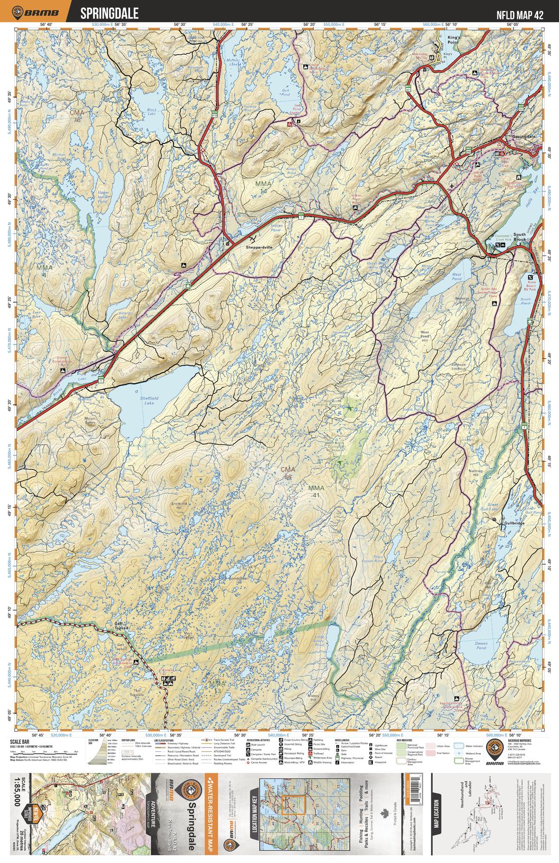 This recreation topographic map for Springdale highlights all the logging/resource roads, hunting areas, fishing lakes & streams, campsites, paddling routes for canoeing and kayaking, wildlife viewing areas, multi-use trails for hiking, biking, horseback riding, cross-country skiing and snowshoeing, motorized trails for ATVing and snowmobiling & more. Covering 3,040 km2 (1,170 mi2), this 1:85,000 scale map measures 48 x 63.5 km (30 x 39.5 mi), providing you with more topographic and recreational detail for the Fortune area than any other map on the market. Special features include countless roads, trails and recreational Points of Interest. Included on this map are Springdale, Sheffield Lake, Indian River, Sandy Brook, Dawes Pond, Great Gull Lake, Halls Bay, Goodyear's Cove Park and more!