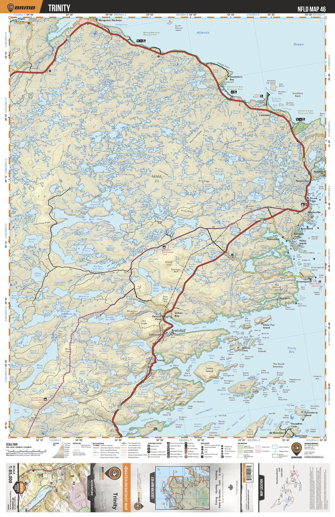 This recreation topographic map for Trinity highlights all the logging/resource roads, hunting areas, fishing lakes & streams, campsites, paddling routes for canoeing and kayaking, wildlife viewing areas, multi-use trails for hiking, biking, horseback riding, cross-country skiing and snowshoeing, motorized trails for ATVing and snowmobiling & more. Covering 3,040 km2 (1,170 mi2), this 1:85,000 scale map measures 48 x 63.5 km (30 x 39.5 mi), providing you with more topographic and recreational detail for the Fortune area than any other map on the market. Special features include countless roads, trails and recreational Points of Interest. Included on this map are Trinity Bay, Deadman's Bay Provincial Park, Windmill Bight Provincial Park, Ten Mile Pond, Lockers Reach and more!