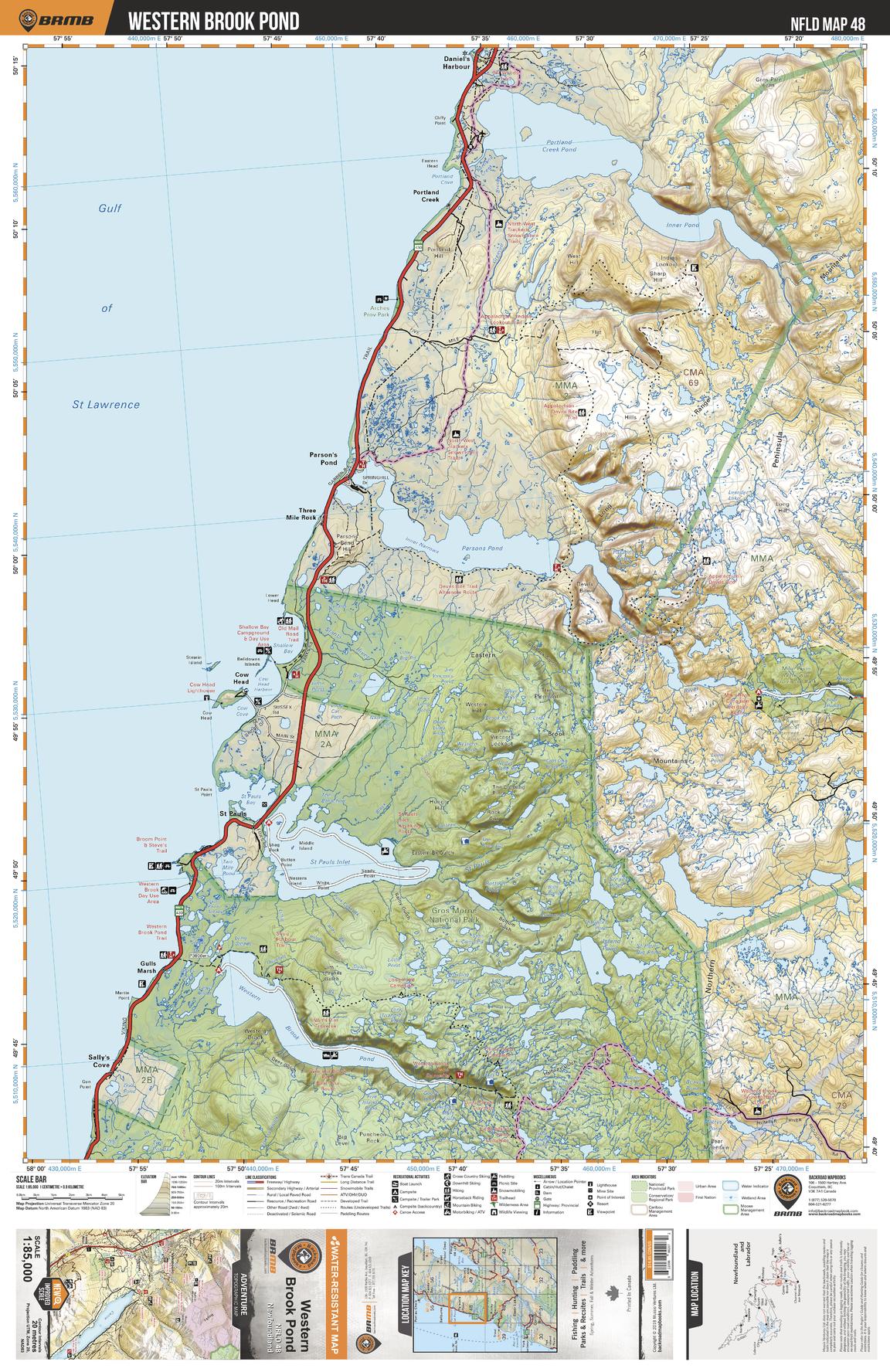 This recreation topographic map for Western Brook Pond highlights all the logging/resource roads, hunting areas, fishing lakes & streams, campsites, paddling routes for canoeing and kayaking, wildlife viewing areas, multi-use trails for hiking, biking, horseback riding, cross-country skiing and snowshoeing, motorized trails for ATVing and snowmobiling & more. Covering 3,040 km2 (1,170 mi2), this 1:85,000 scale map measures 48 x 63.5 km (30 x 39.5 mi), providing you with more topographic and recreational detail for the Fortune area than any other map on the market. Special features include countless roads, trails and recreational Points of Interest. Included on this map are Western Brook Pond, Portland Creek pond, Parsons Pond, Gros Morne National Park, St Pauls Inlet, Main River Waterway Provincial Park and more!