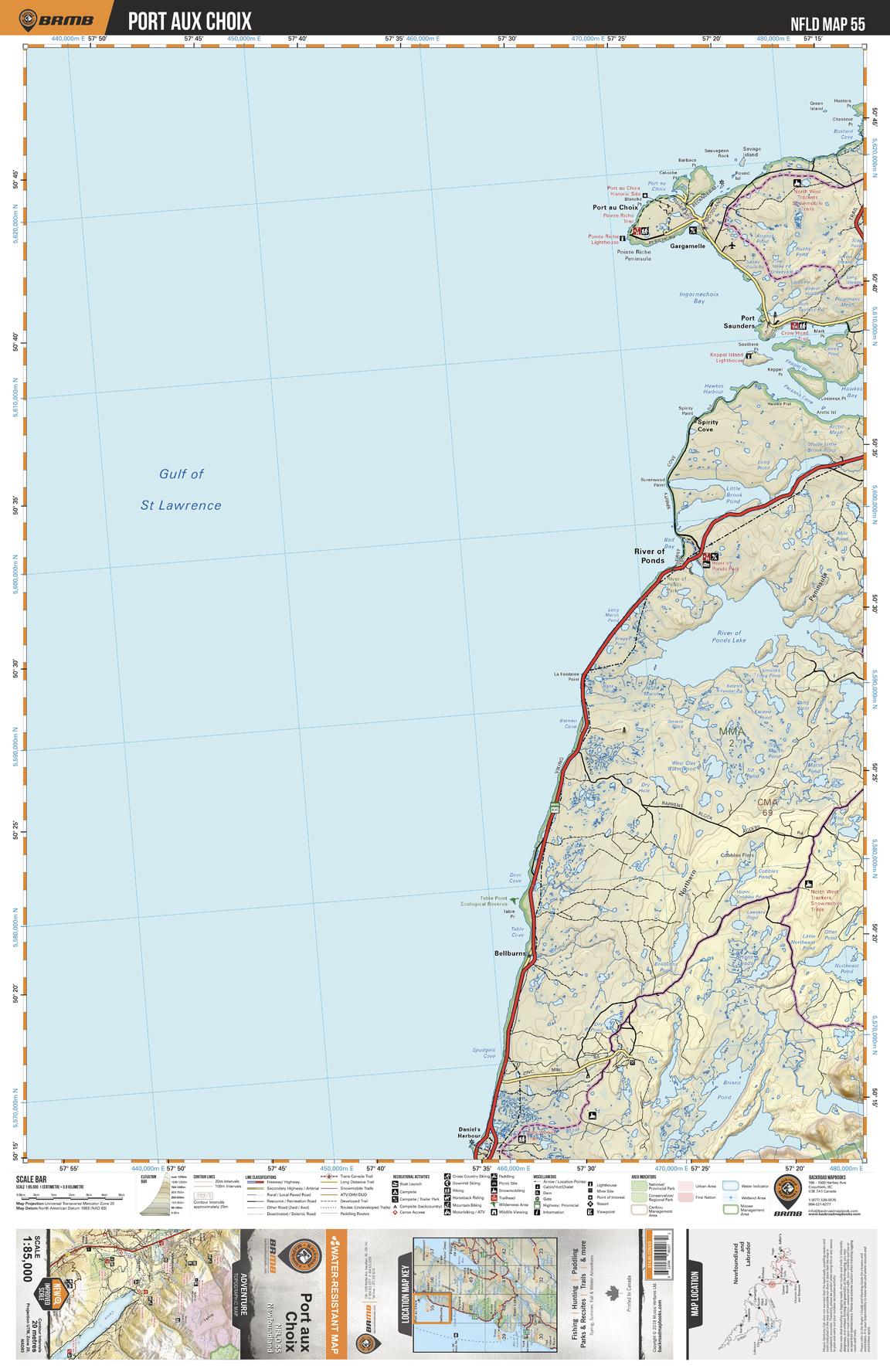 This recreation topographic map for Port aux Choix highlights all the logging/resource roads, hunting areas, fishing lakes & streams, campsites, paddling routes for canoeing and kayaking, wildlife viewing areas, multi-use trails for hiking, biking, horseback riding, cross-country skiing and snowshoeing, motorized trails for ATVing and snowmobiling & more. Covering 3,040 km2 (1,170 mi2), this 1:85,000 scale map measures 48 x 63.5 km (30 x 39.5 mi), providing you with more topographic and recreational detail for the Fortune area than any other map on the market. Special features include countless roads, trails and recreational Points of Interest. Included on this map are Port aux Choix, River Of Ponds Lake, Brians Pond, Little Brook Pond, Hawkes Bay, Ingornachoix Bay and more!