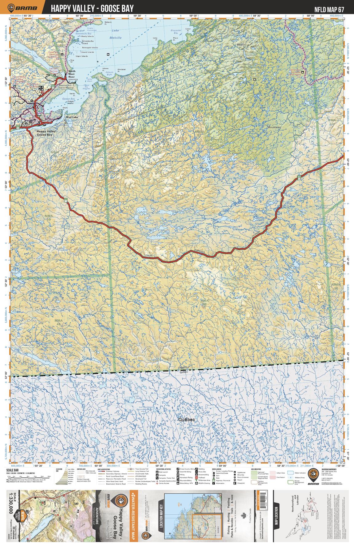 This recreation topographic map for Happy Valley - Goose Bay Labrador highlights all the logging/resource roads, hunting areas, fishing lakes & streams, campsites, paddling routes for canoeing and kayaking, wildlife viewing areas, multi-use trails for hiking, biking, horseback riding, cross-country skiing and snowshoeing, motorized trails for ATVing and snowmobiling & more. Covering 49,475 km2 (19,100 mi2), this 1:330,000 scale map measures 193 x 256.5 km (120 x 159 mi), providing you with more topographic and recreational detail for the Fortune area than any other map on the market. Special features include countless roads, trails and recreational Points of Interest. Included on this map are Happy Valley Goose Bay, Lake Melville, Goose Bay, Mealy Mountain, Kenamu River, Eagle River, Grand Lake, Sebaskachu River and more!