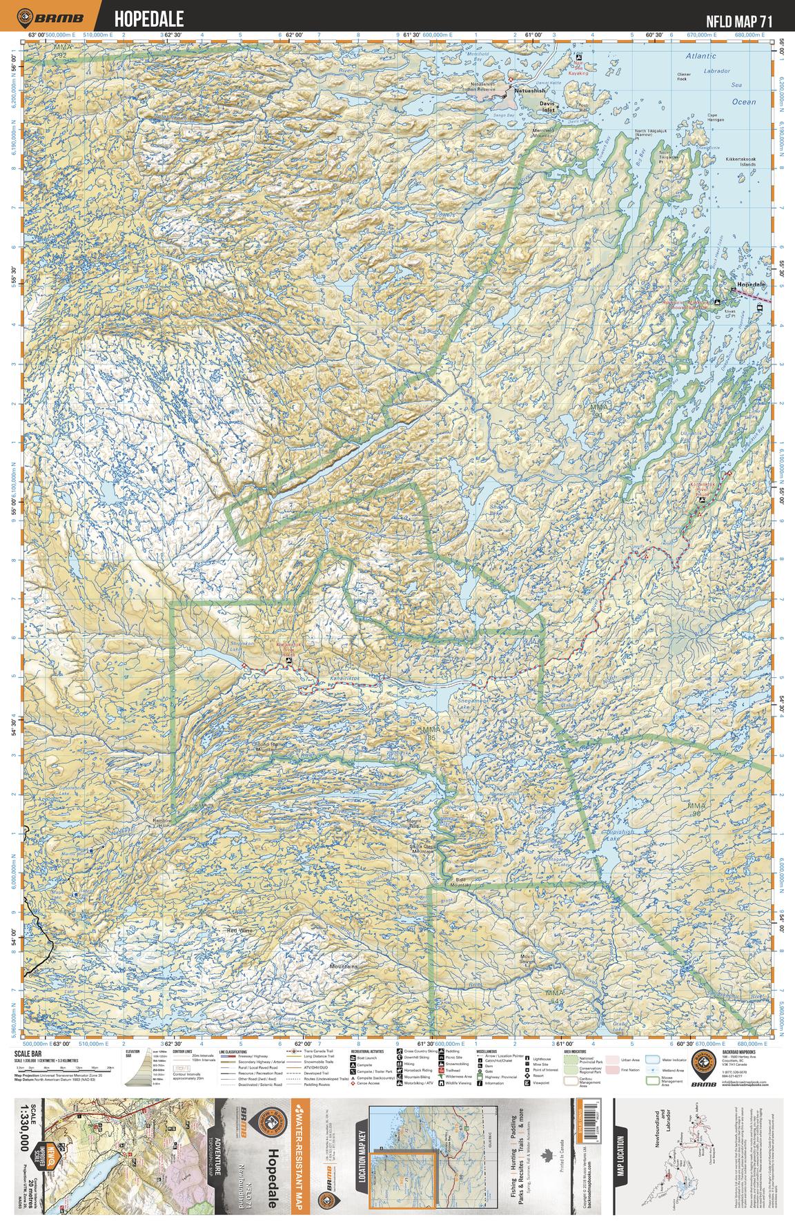 This recreation topographic map for Hopedale Labrador highlights all the logging/resource roads, hunting areas, fishing lakes & streams, campsites, paddling routes for canoeing and kayaking, wildlife viewing areas, multi-use trails for hiking, biking, horseback riding, cross-country skiing and snowshoeing, motorized trails for ATVing and snowmobiling & more. Covering 49,475 km2 (19,100 mi2), this 1:330,000 scale map measures 193 x 256.5 km (120 x 159 mi), providing you with more topographic and recreational detail for the Fortune area than any other map on the market. Special features include countless roads, trails and recreational Points of Interest. Included on this map are Hopedale, Harp Lake, Adlatok River, Hunt River, Sebaskchu River, Nipishish Lake, Shapiro Lake, Flowers River and more!