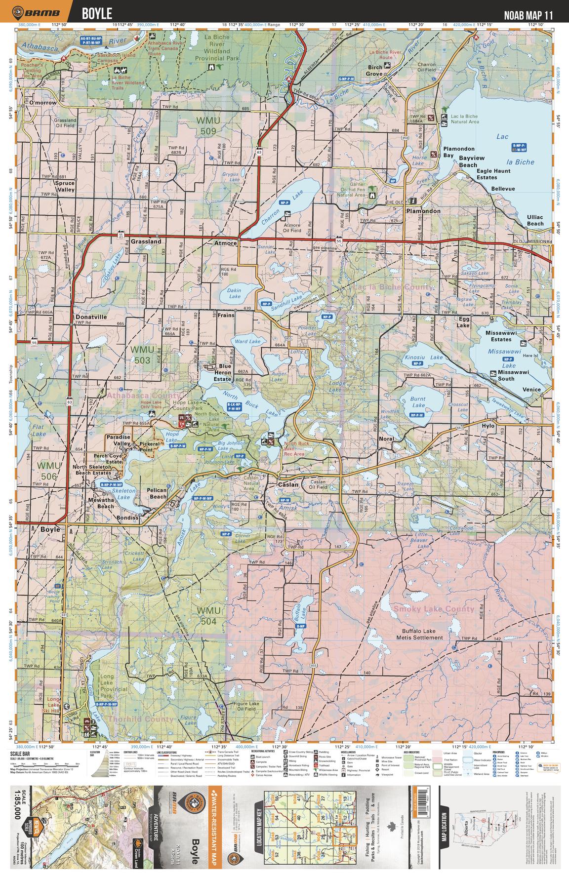 This recreation topographic map for the Boyle area highlights all the logging and resource roads, multi-use trails for hikers, mountain bikers, horseback riders, cross-country skiers and snowshoers, motorized trails for ATVers and snowmobilers, fishing lakes and rivers, recreation areas, campgrounds, day-use areas, viewpoints, backcountry campsites, work camps, backcountry huts and cabins and more. No other map for the area provides you with this level of recreational or topographic detail. Special features include private land, labelled fish species and countless new roads, trails and recreational Points of Interest. This map also features enhanced oil & gas resource information, more detailed water features and seismic line corridors. Covering 1,268 km2 (490 mi2), this 1:85,000 scale map measures 96 x 127 km (59.5 x 79 mi). Included on the map are Lac la Biche, Missawawi Lake, North Buck Lake, Charron Lake, Buffalo Lake, Skeleton Lake, Long Lake, Boyle, Plamondon, Atmore and more!