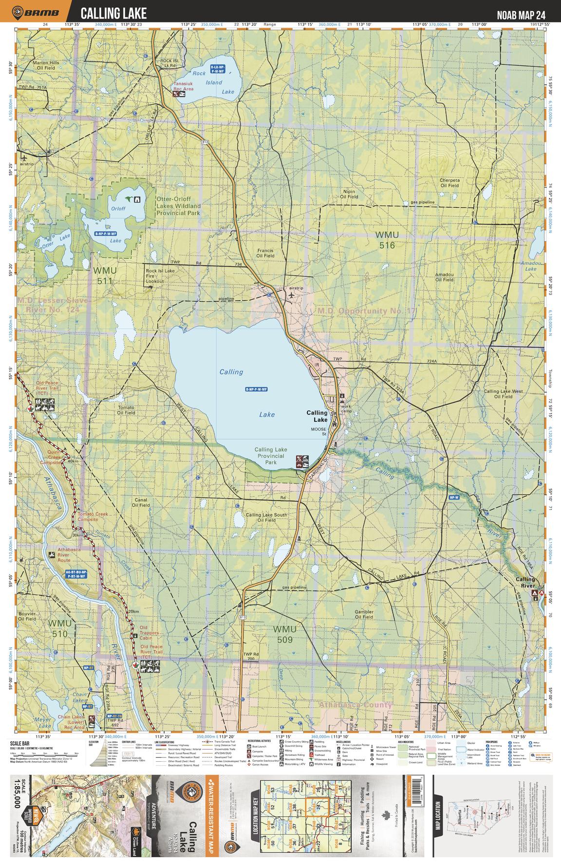 This recreation topographic map for the Calling Lake area highlights all the logging and resource roads, multi-use trails for hikers, mountain bikers, horseback riders, cross-country skiers and snowshoers, motorized trails for ATVers and snowmobilers, fishing lakes and rivers, recreation areas, campgrounds, day-use areas, viewpoints, backcountry campsites, work camps, backcountry huts and cabins and more. No other map for the area provides you with this level of recreational or topographic detail. Special features include private land, labelled fish species and countless new roads, trails and recreational Points of Interest. This map also features enhanced oil & gas resource information, more detailed water features and seismic line corridors. Covering 1,268 km2 (490 mi2), this 1:85,000 scale map measures 96 x 127 km (59.5 x 79 mi). Included on the map are Calling Lake, Rock Island Lake, Orloff Lake, Otter Lake, Calling River, Athabasca River, Calling Lake Prov Park, Otter-Orloff Lakes Prov Park, Amadou Lake, Tomato Creek and more!