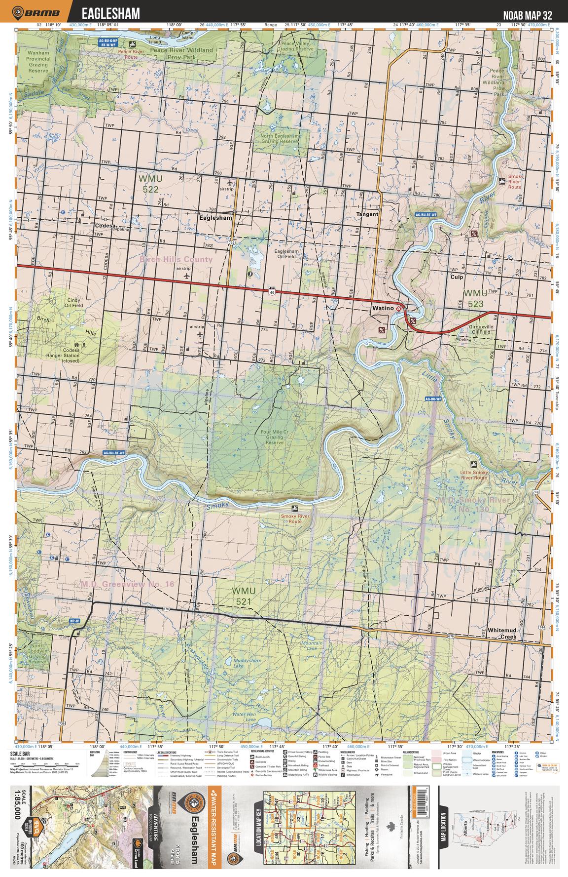 This recreation topographic map for the Eaglesham area highlights all the logging and resource roads, multi-use trails for hikers, mountain bikers, horseback riders, cross-country skiers and snowshoers, motorized trails for ATVers and snowmobilers, fishing lakes and rivers, recreation areas, campgrounds, day-use areas, viewpoints, backcountry campsites, work camps, backcountry huts and cabins and more. No other map for the area provides you with this level of recreational or topographic detail. Special features include private land, labelled fish species and countless new roads, trails and recreational Points of Interest. This map also features enhanced oil & gas resource information, more detailed water features and seismic line corridors. Covering 1,268 km2 (490 mi2), this 1:85,000 scale map measures 96 x 127 km (59.5 x 79 mi). Included on the map are Smoky River, Little Smoky River, Watino, Four Mile Creek Grazing Reserve, Pease River Prov Park, Tangent, Eaglesham, Whitemud Creek, Codesa, Culp and more!