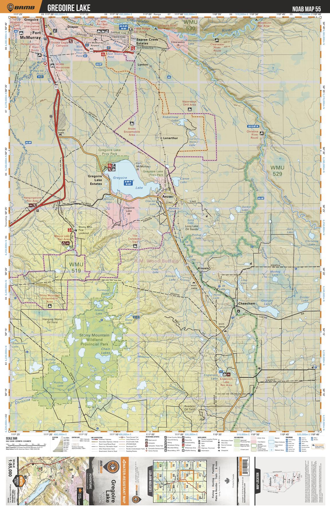 This recreation topographic map for the Gregoire Lake area highlights all the logging and resource roads, multi-use trails for hikers, mountain bikers, horseback riders, cross-country skiers and snowshoers, motorized trails for ATVers and snowmobilers, fishing lakes and rivers, recreation areas, campgrounds, day-use areas, viewpoints, backcountry campsites, work camps, backcountry huts and cabins and more. No other map for the area provides you with this level of recreational or topographic detail. Special features include private land, labelled fish species and countless new roads, trails and recreational Points of Interest. This map also features enhanced oil & gas resource information, more detailed water features and seismic line corridors. Covering 1,268 km2 (490 mi2), this 1:85,000 scale map measures 96 x 127 km (59.5 x 79 mi). Included on the map are Stony Mountain Prov Park, Gregoire Lake, Cheecham, Engstrom Lake, Anzac, Fort McMurray, Christina River, Gregoire River, Hangingstone River, Clearwater River and more!