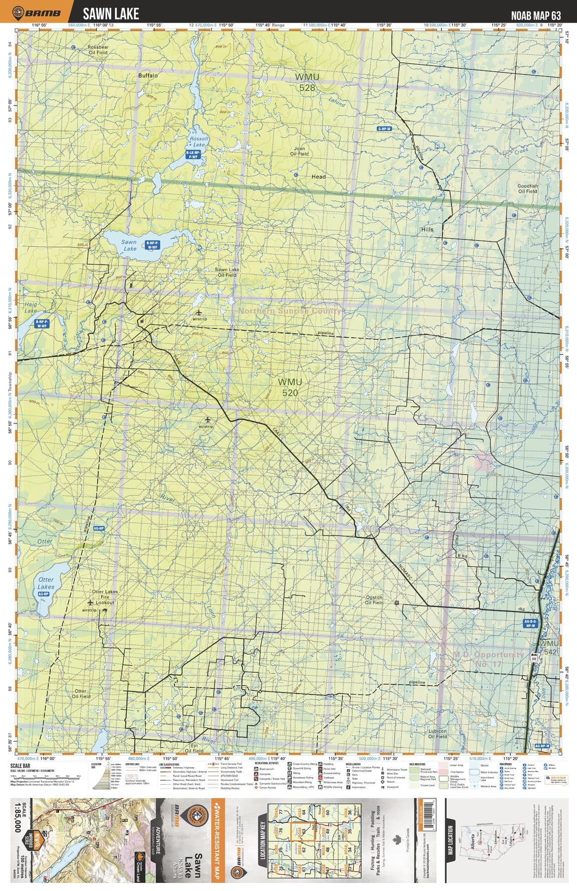This recreation topographic map for the Sawn Lake area highlights all the logging and resource roads, multi-use trails for hikers, mountain bikers, horseback riders, cross-country skiers and snowshoers, motorized trails for ATVers and snowmobilers, fishing lakes and rivers, recreation areas, campgrounds, day-use areas, viewpoints, backcountry campsites, work camps, backcountry huts and cabins and more. No other map for the area provides you with this level of recreational or topographic detail. Special features include private land, labelled fish species and countless new roads, trails and recreational Points of Interest. This map also features enhanced oil & gas resource information, more detailed water features and seismic line corridors. Covering 1,268 km2 (490 mi2), this 1:85,000 scale map measures 96 x 127 km (59.5 x 79 mi). Included on the map are Otter Lakes, Sawn Lakes, Russell Lake, Loom River, Lafond Creek and more!