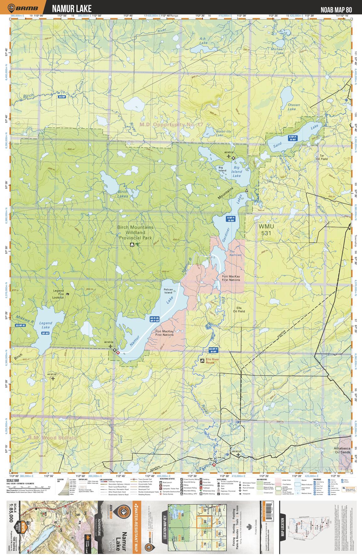 This recreation topographic map for the Namur Lake area highlights all the logging and resource roads, multi-use trails for hikers, mountain bikers, horseback riders, cross-country skiers and snowshoers, motorized trails for ATVers and snowmobilers, fishing lakes and rivers, recreation areas, campgrounds, day-use areas, viewpoints, backcountry campsites, work camps, backcountry huts and cabins and more. No other map for the area provides you with this level of recreational or topographic detail. Special features include private land, labelled fish species and countless new roads, trails and recreational Points of Interest. This map also features enhanced oil & gas resource information, more detailed water features and seismic line corridors. Covering 1,268 km2 (490 mi2), this 1:85,000 scale map measures 96 x 127 km (59.5 x 79 mi). Included on the map are Namur Lake, Legend Lake, Gardiner Lake, Sand Lake, Birch Mountains Wildland Provincial Park, Ells River, Birch River and more!