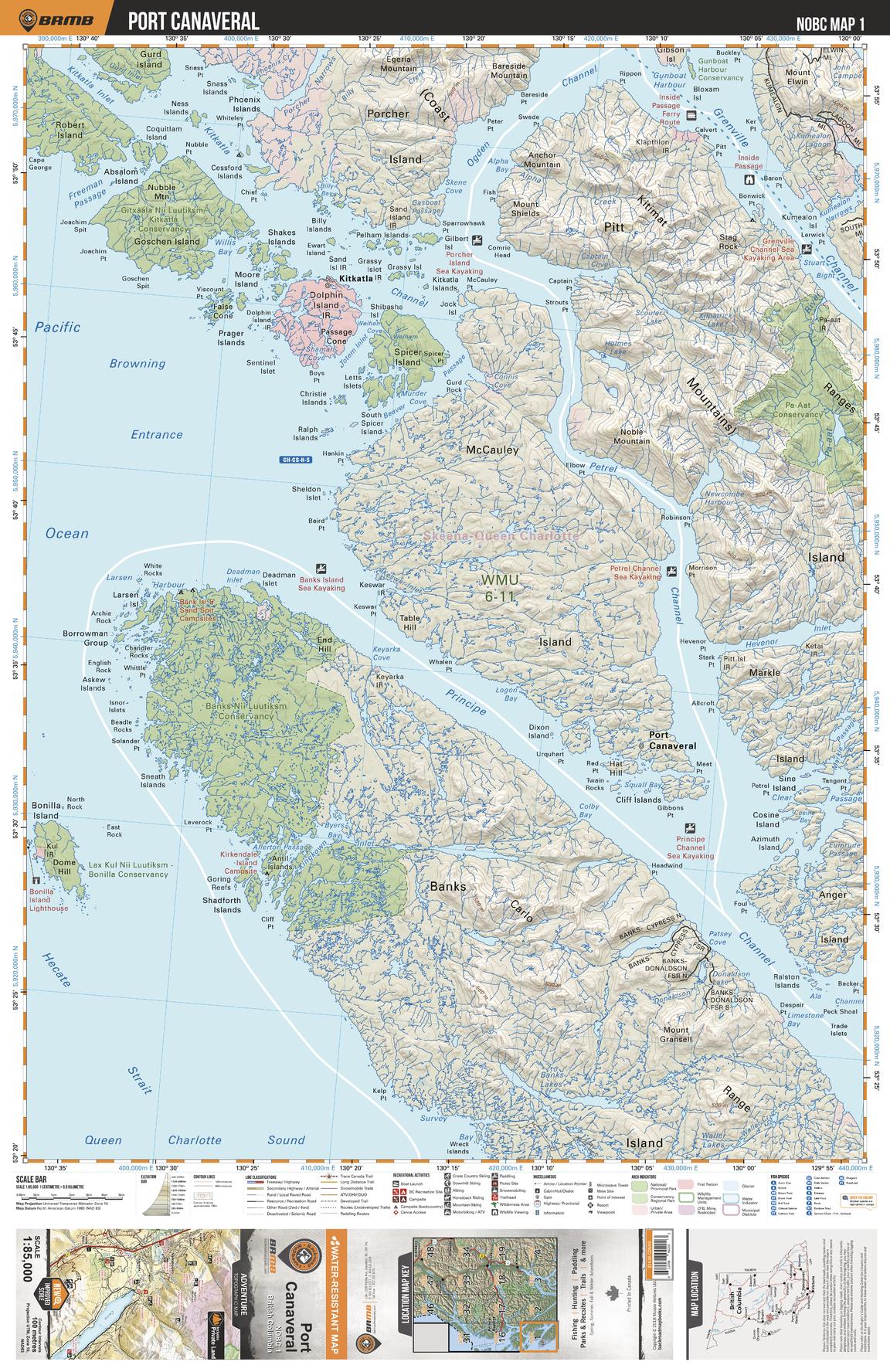 This recreation topographic map for the Port Canaveral area highlights all the logging roads, trails and recreation features for fishing, hunting, camping, hiking, mountain biking, canoeing, kayaking, backcountry skiing, wildlife viewing, ATVing, snowmobiling and more. No other map for the area provides you this level of recreational and topographic detail. New features include private land and labelled fish species plus countless new roads, trails and recreational Points of Interest. Covering Banks Island, McCauley Island, Port Canaveral, Kitkatla, Pitt Island, Markle Island, Anger Island, Porcher Island, Dolphin Island and Goschen Island, this map contains new features such as private land and labelled fish species. This 1:85,000 scale map covers 3,040 km2 (1,175 mi2), measuring 50 x 63.5 km (30 x 39.5 mi).
