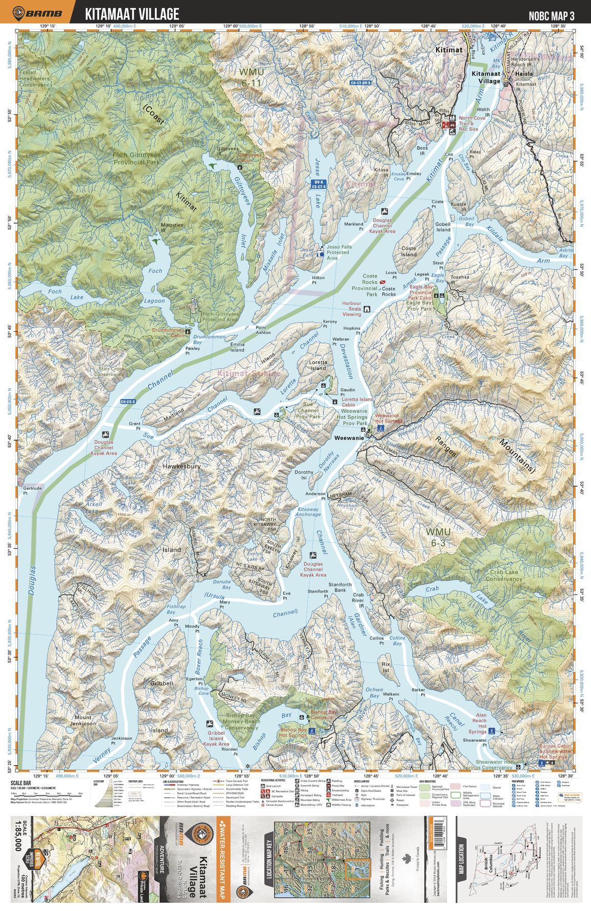 This recreation topographic map for the Kitamaat Village area highlights all the logging roads, trails and recreation features for fishing, hunting, camping, hiking, mountain biking, canoeing, kayaking, backcountry skiing, wildlife viewing, ATVing, snowmobiling and more. No other map for the area provides you this level of recreational and topographic detail. New features include private land and labelled fish species plus countless new roads, trails and recreational Points of Interest. Covering Foch Gilttoyees Prov Park, Weewanie, Kitimat, Gribble Island, Douglas Channel, Hawkesbury Island, Eagle Bay, Coste Rocks, Devastation Channel, Kitimaat Village and more, this map contains new features such as private land and labelled fish species. This 1:85,000 scale map covers 3,040 km2 (1,175 mi2), measuring 50 x 63.5 km (30 x 39.5 mi).