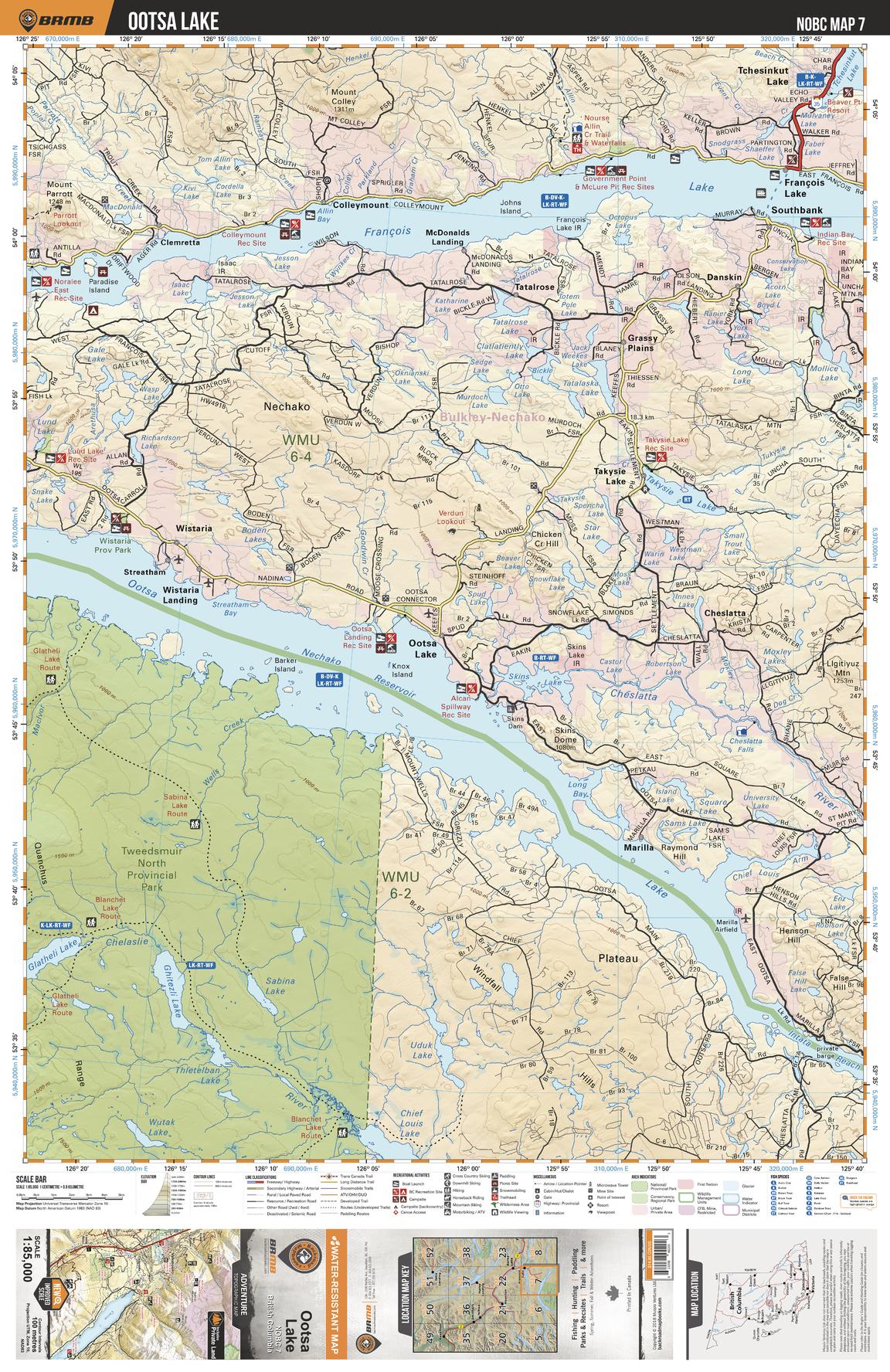This recreation topographic map for the Ootsa Lake area highlights all the logging roads, trails and recreation features for fishing, hunting, camping, hiking, mountain biking, canoeing, kayaking, backcountry skiing, wildlife viewing, ATVing, snowmobiling and more. No other map for the area provides you this level of recreational and topographic detail. New features include private land and labelled fish species plus countless new roads, trails and recreational Points of Interest. Covering Tweedsmuir Prov Park, Ootsa Lake, Marilla, Wistaria, Francois Lake, Takysie Lake, Clemretta, McDonalds Landing, Southbank, Cheslatta River and more, this map contains new features such as private land and labelled fish species. This 1:85,000 scale map covers 3,040 km2 (1,175 mi2), measuring 50 x 63.5 km (30 x 39.5 mi).