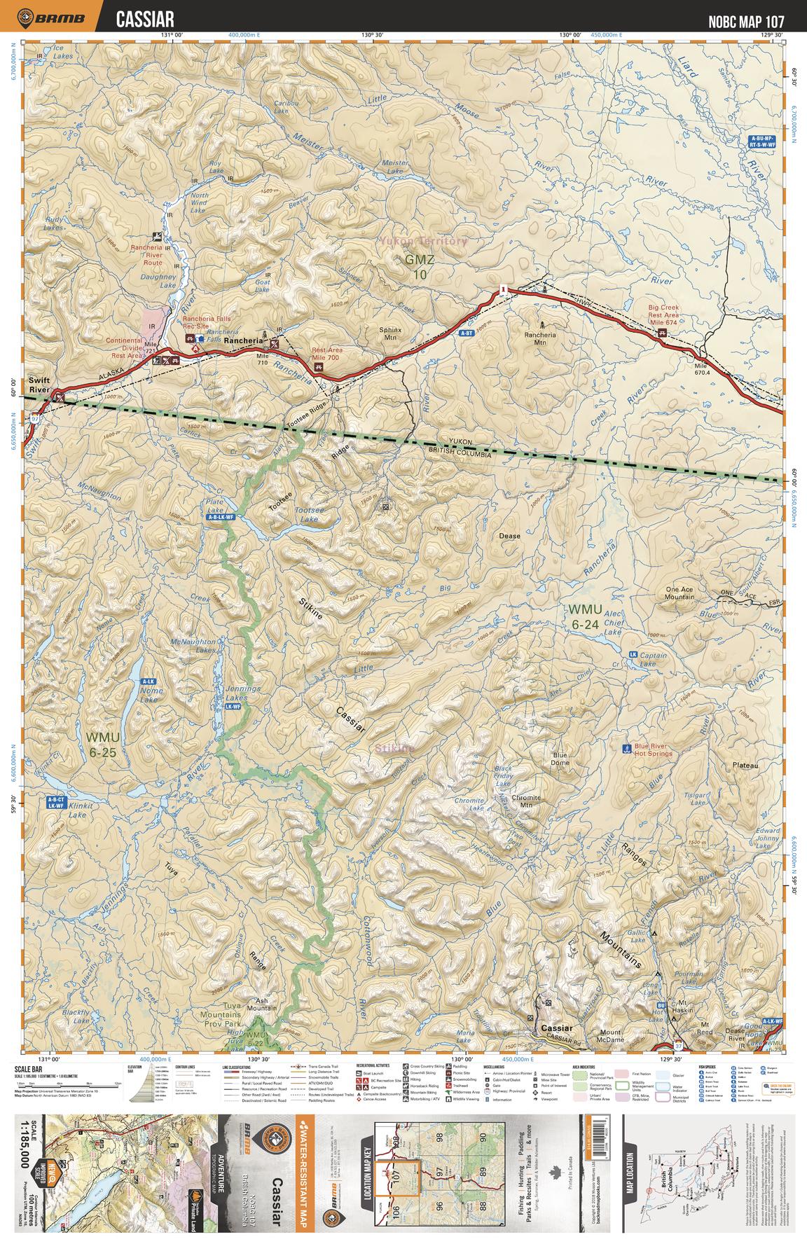 This recreation map for the Cassiar area highlights all the logging and resource roads, recreational features and trails for hiking, mountain biking, ATVing, snowmobiling, skiing, snowshoeing, fishing, camping, hunting, canoeing, kayaking, wildlife viewing and more. New features include private land and labelled fish species, plus new roads, recreational trails and Points of Interest. No other map for the area provides you with this level of recreational or topographic detail. Measuring 105 x 140 km (65 x 87 mi), this 1:185,000 scale map covers 14,750 km2 (5,695 mi2) in total and includes Rancheria, Cassiar, Meister River, Liard River, Little Moose River, Swift River, Rancheria River, One Ace Mountain, Klinkit Lake, McNaughton Lakes and more!