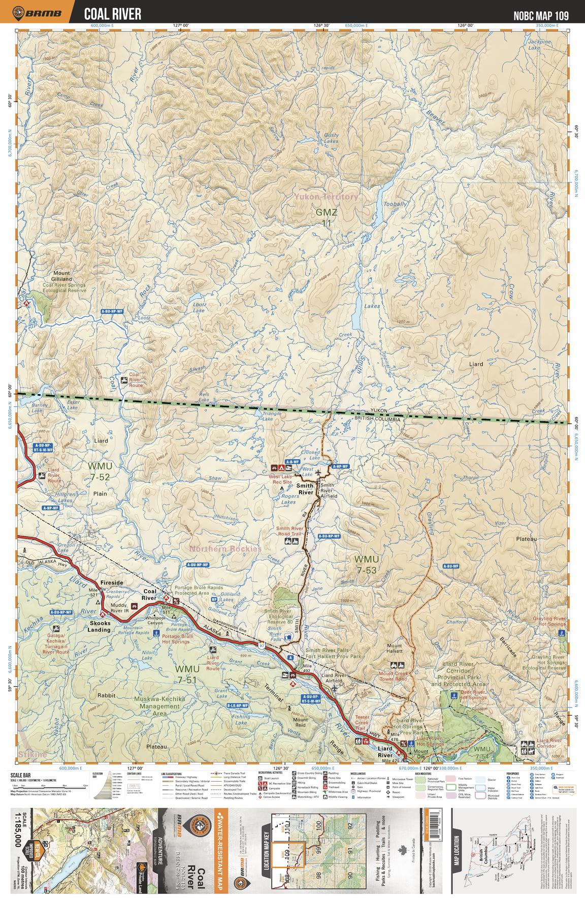 This recreation map for the Coal River area highlights all the logging and resource roads, recreational features and trails for hiking, mountain biking, ATVing, snowmobiling, skiing, snowshoeing, fishing, camping, hunting, canoeing, kayaking, wildlife viewing and more. New features include private land and labelled fish species, plus new roads, recreational trails and Points of Interest. No other map for the area provides you with this level of recreational or topographic detail. Measuring 105 x 140 km (65 x 87 mi), this 1:185,000 scale map covers 14,750 km2 (5,695 mi2) in total and includes Maxhamish Lake, Kuskwa-Kechika Management Area, Smith River, Liard River, Skooks Landing, Coal River, Fireside, Grayling River, West Lake, Triangle Lake and more!