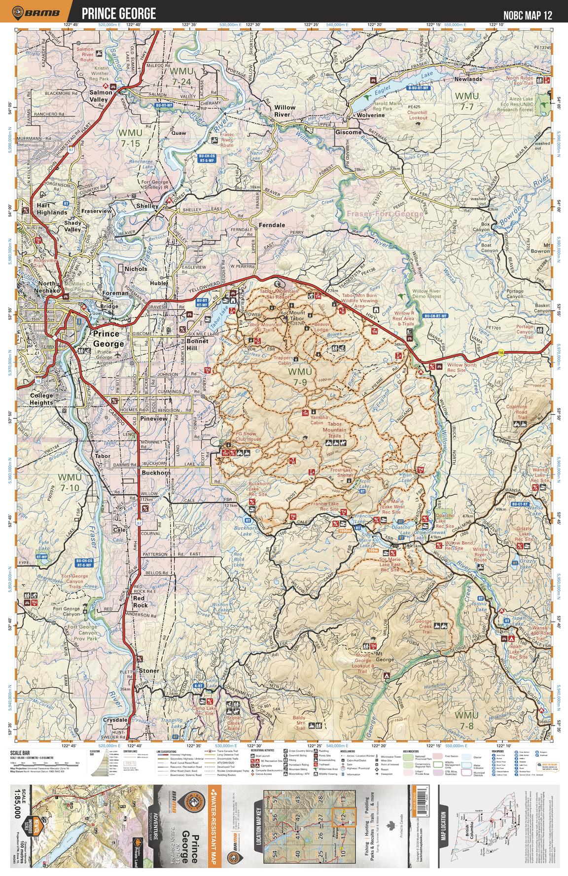 This recreation topographic map for the Prince George area highlights all the logging roads, trails and recreation features for fishing, hunting, camping, hiking, mountain biking, canoeing, kayaking, backcountry skiing, wildlife viewing, ATVing, snowmobiling and more. No other map for the area provides you this level of recreational and topographic detail. New features include private land and labelled fish species plus countless new roads, trails and recreational Points of Interest. Covering Prince George, Eaglet Lake, Red Rock, Willow River, Salmon Valley, Tabot Lake, Newlands, Fort George Canyon Prov Park, Stoner, Ferndale and more, this map contains new features such as private land and labelled fish species. This 1:85,000 scale map covers 3,040 km2 (1,175 mi2), measuring 50 x 63.5 km (30 x 39.5 mi).