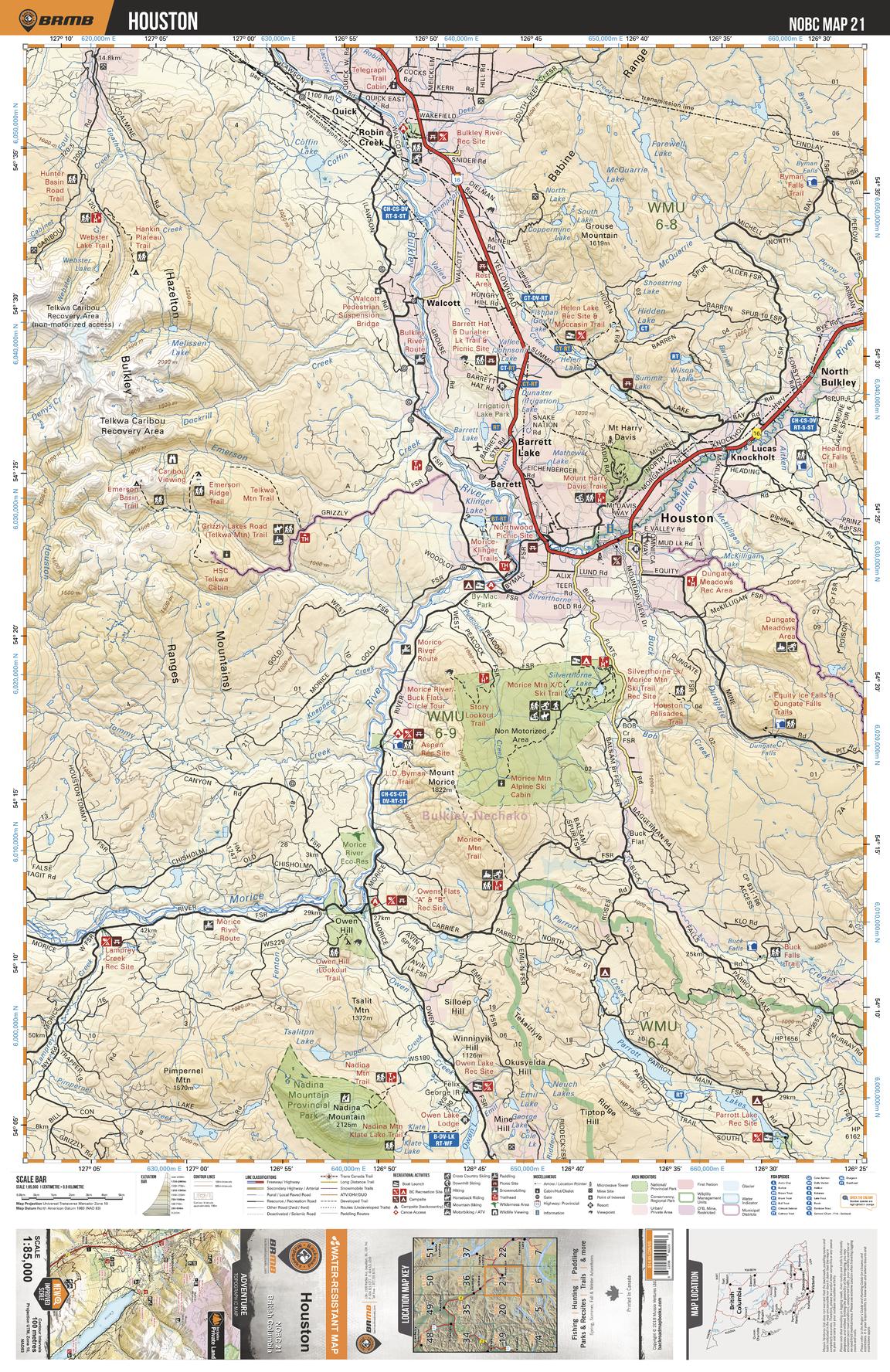 This recreation topographic map for the Houston area highlights all the logging roads, trails and recreation features for fishing, hunting, camping, hiking, mountain biking, canoeing, kayaking, backcountry skiing, wildlife viewing, ATVing, snowmobiling and more. No other map for the area provides you this level of recreational and topographic detail. New features include private land and labelled fish species plus countless new roads, trails and recreational Points of Interest. Covering Houston, Parrot Lakes, Houston, Bulkley River, North Bulkley, Barrett Lake, Walcott, Morice River, Robin Creek, Nadine Mtn and more, this map contains new features such as private land and labelled fish species. This 1:85,000 scale map covers 3,040 km2 (1,175 mi2), measuring 50 x 63.5 km (30 x 39.5 mi).
