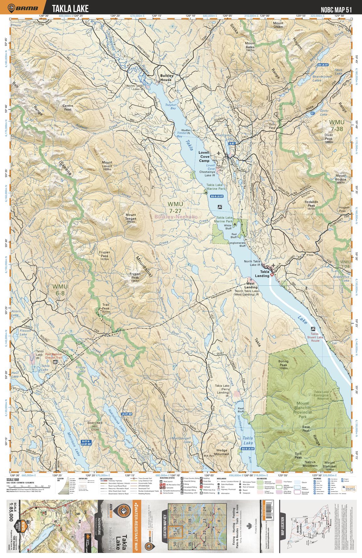 This recreation topographic map for the Takla Lake area highlights all the logging roads, trails and recreation features for fishing, hunting, camping, hiking, mountain biking, canoeing, kayaking, backcountry skiing, wildlife viewing, ATVing, snowmobiling and more. No other map for the area provides you this level of recreational and topographic detail. New features include private land and labelled fish species plus countless new roads, trails and recreational Points of Interest. Covering Takla Lake, Driftwood River, Takla Landing, Lovell Cove Camp, Bulkley House, Mount Blanchet Prov Park, Morrison Lake, Skeena Mtns, Diver Lake, Friday Lake and more, this map contains new features such as private land and labelled fish species. This 1:85,000 scale map covers 3,040 km2 (1,175 mi2), measuring 50 x 63.5 km (30 x 39.5 mi).
