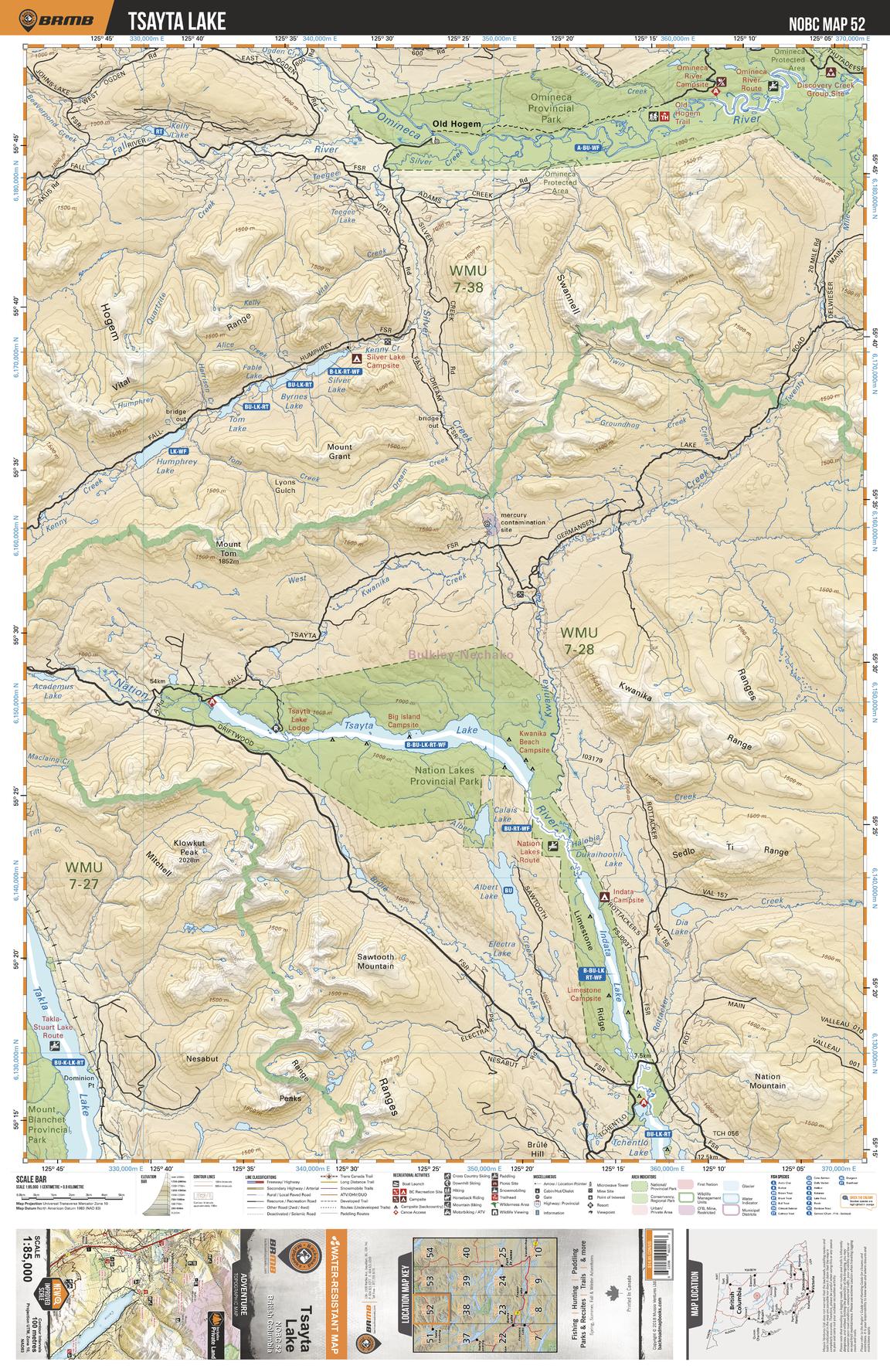 This recreation topographic map for the Tsayta Lake area highlights all the logging roads, trails and recreation features for fishing, hunting, camping, hiking, mountain biking, canoeing, kayaking, backcountry skiing, wildlife viewing, ATVing, snowmobiling and more. No other map for the area provides you this level of recreational and topographic detail. New features include private land and labelled fish species plus countless new roads, trails and recreational Points of Interest. Covering Tsayta Lake, Old Hogem, Omineca Prov Park, Nation Lakes Prov Park, Indata Lake, Tchentlo Lake, Nation River, Takla Lake, Fall River, Omineca River and more, this map contains new features such as private land and labelled fish species. This 1:85,000 scale map covers 3,040 km2 (1,175 mi2), measuring 50 x 63.5 km (30 x 39.5 mi).