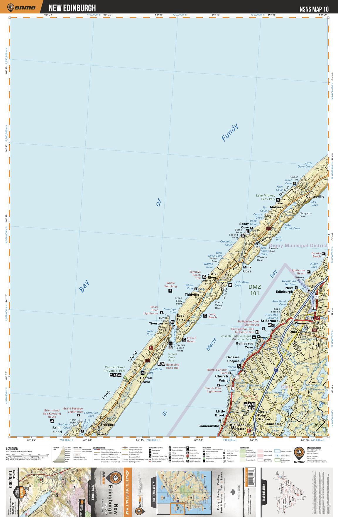 This recreation topographic map for New Edinburgh highlights all the logging/resource roads, hunting areas, fishing lakes & streams, campsites, paddling routes for canoeing and kayaking, wildlife viewing areas, multi-use trails for hiking, biking, horseback riding, cross-country skiing and snowshoeing, motorized trails for ATVing and snowmobiling & more. Covering 1,925 km2 (745 mi2), this 1:65,000 scale map measures 38 x 50 km (24 x 31 mi), providing you with more topographic and recreational detail for the Yarmouth area than any other map on the market. Special features include the addition of Crown land areas and countless new roads, trails and recreational Points of Interest. Included on this map are Bay of Fundy, St Marys Bay, Long Island, Weymouth, Church Point, Brier Island, Tiddville, Lake Midway, Little River, New Edinburgh and more!