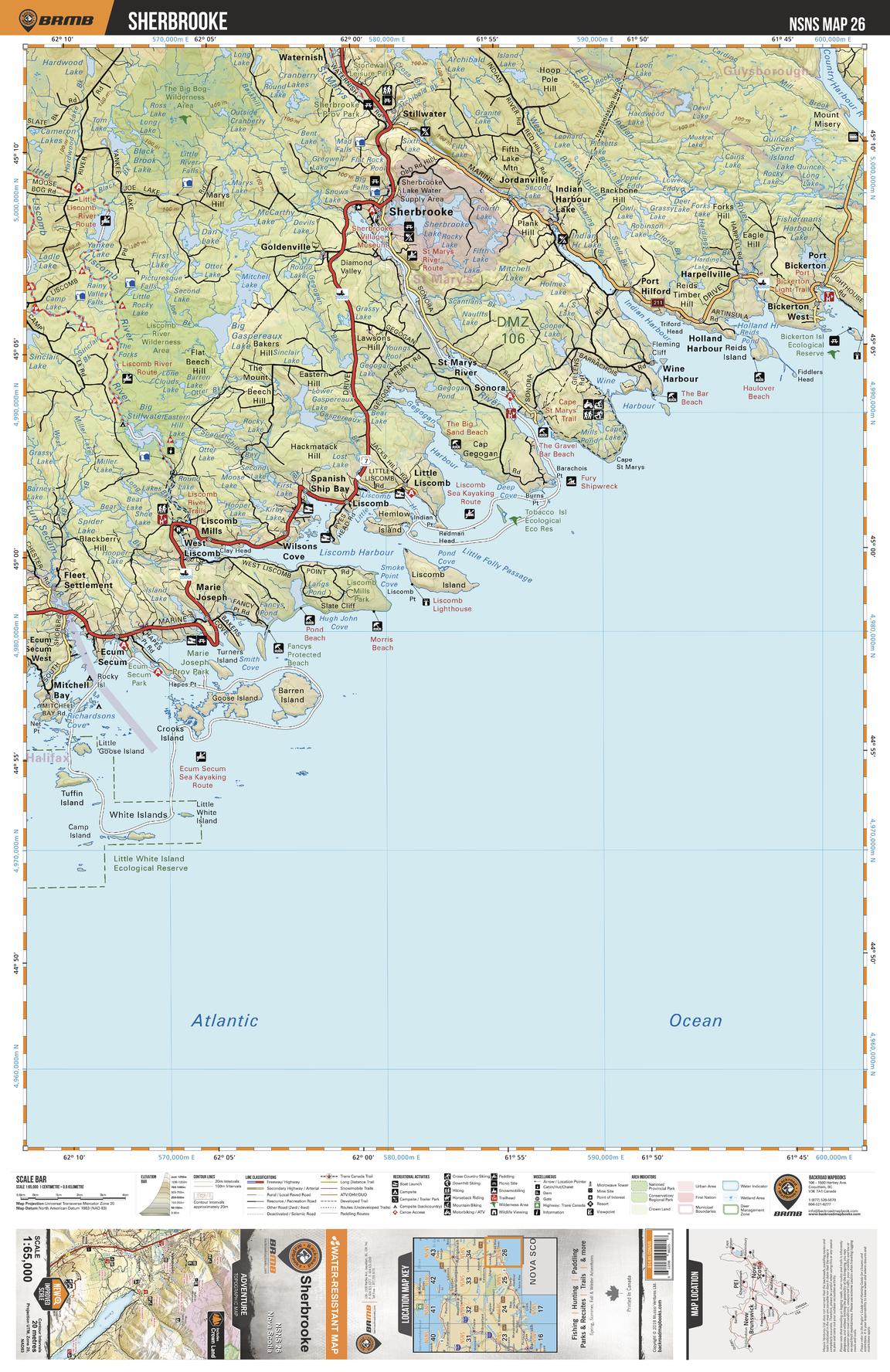 This recreation topographic map for Sherbrooke highlights all the logging/resource roads, hunting areas, fishing lakes & streams, campsites, paddling routes for canoeing and kayaking, wildlife viewing areas, multi-use trails for hiking, biking, horseback riding, cross-country skiing and snowshoeing, motorized trails for ATVing and snowmobiling & more. Covering 1,925 km2 (745 mi2), this 1:65,000 scale map measures 38 x 50 km (24 x 31 mi), providing you with more topographic and recreational detail for the Yarmouth area than any other map on the market. Special features include the addition of Crown land areas and countless new roads, trails and recreational Points of Interest. Included on this map are Sherbrooke, Liscomb Harbour, Gegogan Harbour, St Marys River, Indian Harbour, Holland Harbour, Port Bickerton, Little White Island Eco Reserve, Little Folly Passage, Liscomb River and more!