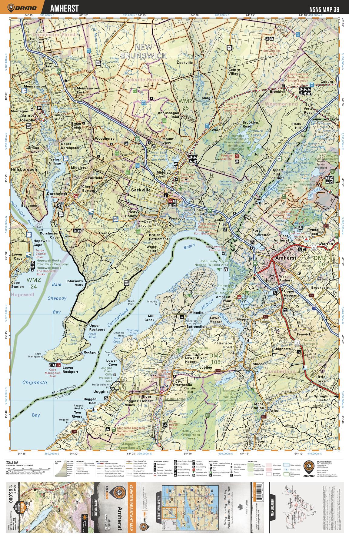 This recreation topographic map for Amherst highlights all the logging/resource roads, hunting areas, fishing lakes & streams, campsites, paddling routes for canoeing and kayaking, wildlife viewing areas, multi-use trails for hiking, biking, horseback riding, cross-country skiing and snowshoeing, motorized trails for ATVing and snowmobiling & more. Covering 1,925 km2 (745 mi2), this 1:65,000 scale map measures 38 x 50 km (24 x 31 mi), providing you with more topographic and recreational detail for the Yarmouth area than any other map on the market. Special features include the addition of Crown land areas and countless new roads, trails and recreational Points of Interest. Included on this map are Chignecto Bay, Cumberland Basin, River Hebert, Maccan River, Amherst, Little Forks, Two Rivers, Missaguash River, Amherst Marsh, Athol and more!