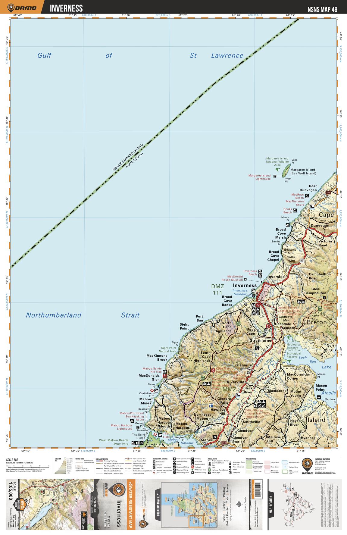 This recreation topographic map for Inverness highlights all the logging/resource roads, hunting areas, fishing lakes & streams, campsites, paddling routes for canoeing and kayaking, wildlife viewing areas, multi-use trails for hiking, biking, horseback riding, cross-country skiing and snowshoeing, motorized trails for ATVing and snowmobiling & more. Covering 1,925 km2 (745 mi2), this 1:65,000 scale map measures 38 x 50 km (24 x 31 mi), providing you with more topographic and recreational detail for the Yarmouth area than any other map on the market. Special features include the addition of Crown land areas and countless new roads, trails and recreational Points of Interest. Included on this map are Inverness, Margaree Island, Dunvegan, Loch Ban, Lake Ainslie, Smithville, Black River, Mabou Harbour, Strathlorne, Gulf of St Lawrence and more!