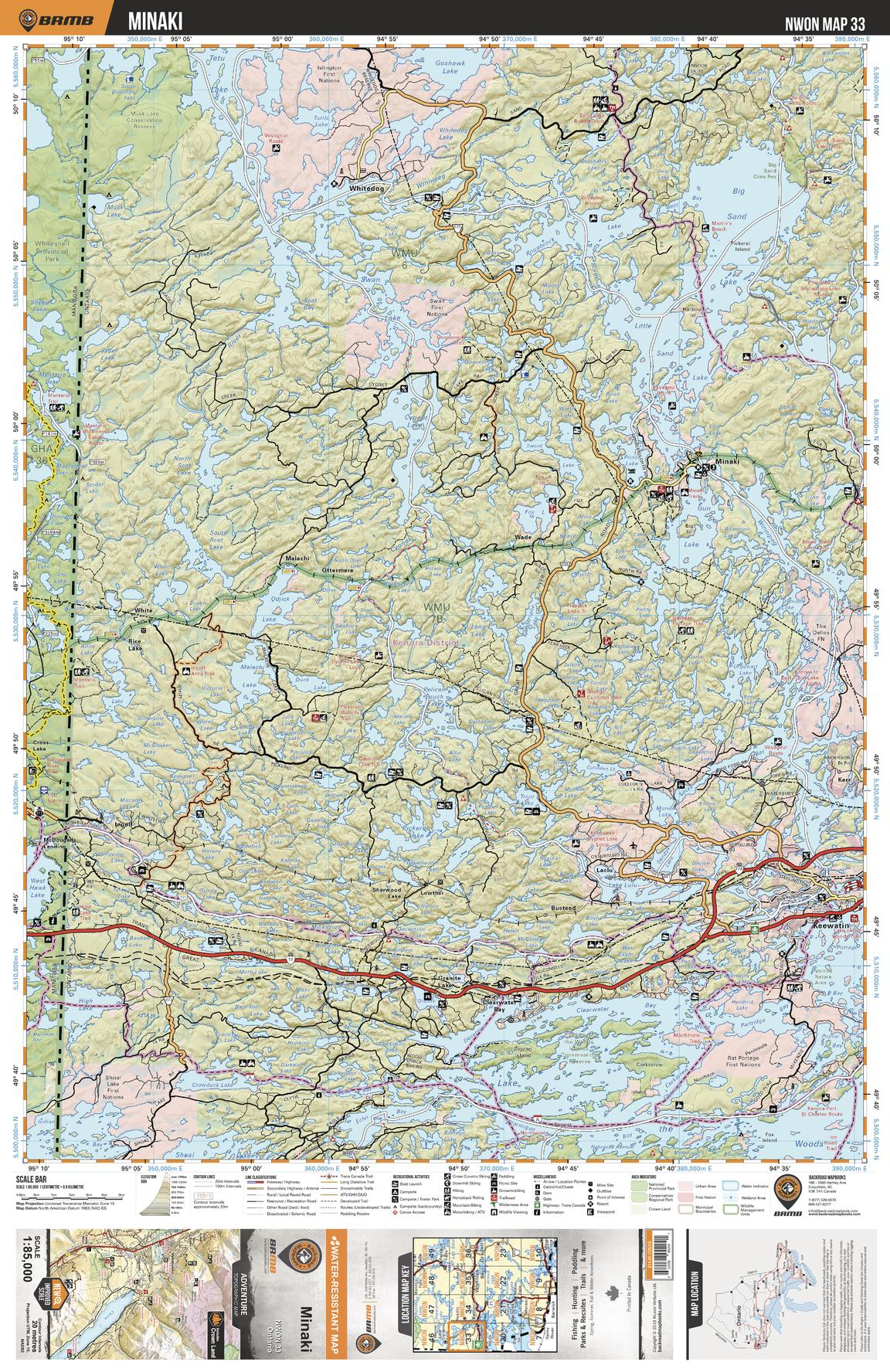 This recreation topographic map for Minaki highlights all the logging/resource roads, hunting areas, fishing lakes & streams, campsites, paddling routes for canoeing and kayaking, wildlife viewing areas, multi-use trails for hiking, biking, horseback riding, cross-country skiing and snowshoeing, motorized trails for ATVing and snowmobiling & more. Covering 3,040 km2 (1,175 mi2), this 1:85,000 scale map measures 48 x 63.5 km (30 x 39.5 mi), providing you with more topographic and recreational detail for the Lac La Croix area than any other map on the market. New features include expanded road and trail data and countless recreational Points of Interest. Included on this map are Minaki, Big Sand Lake, Tetu Lake, Cygnet Lake, Winnipeg River, Lake Of The Woods, Swan Lake, Musk Lake Conservation Reserve and more!