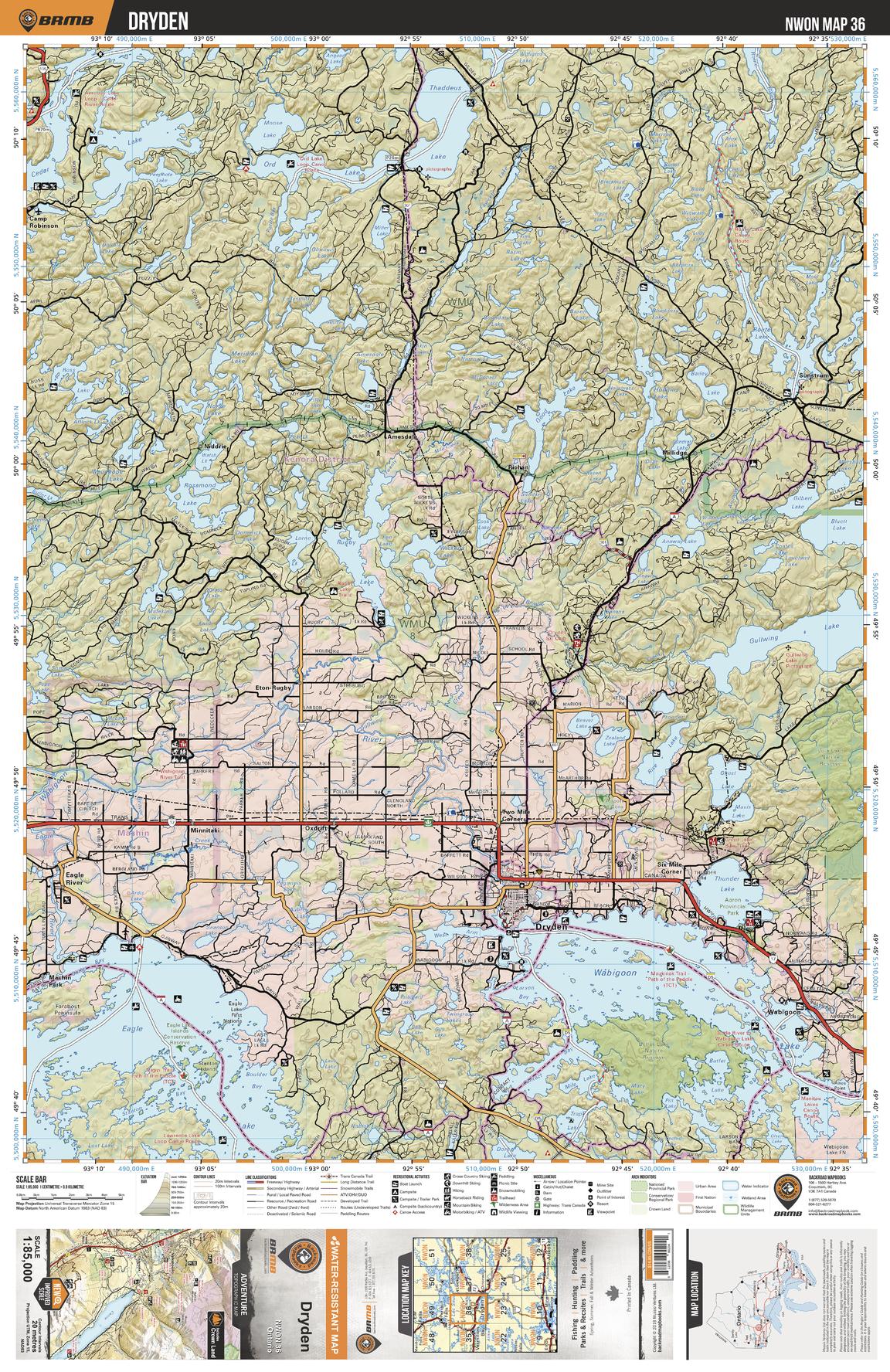 This recreation topographic map for Dryden highlights all the logging/resource roads, hunting areas, fishing lakes & streams, campsites, paddling routes for canoeing and kayaking, wildlife viewing areas, multi-use trails for hiking, biking, horseback riding, cross-country skiing and snowshoeing, motorized trails for ATVing and snowmobiling & more. Covering 3,040 km2 (1,175 mi2), this 1:85,000 scale map measures 48 x 63.5 km (30 x 39.5 mi), providing you with more topographic and recreational detail for the Lac La Croix area than any other map on the market. New features include expanded road and trail data and countless recreational Points of Interest. Included on this map are Dryden, Wabigoon Lake, Eagle Lake, Butler Lake Nature Reserve, Lola Lake Nature Preserve, Rugby Lake, Gullwing Lake and more!