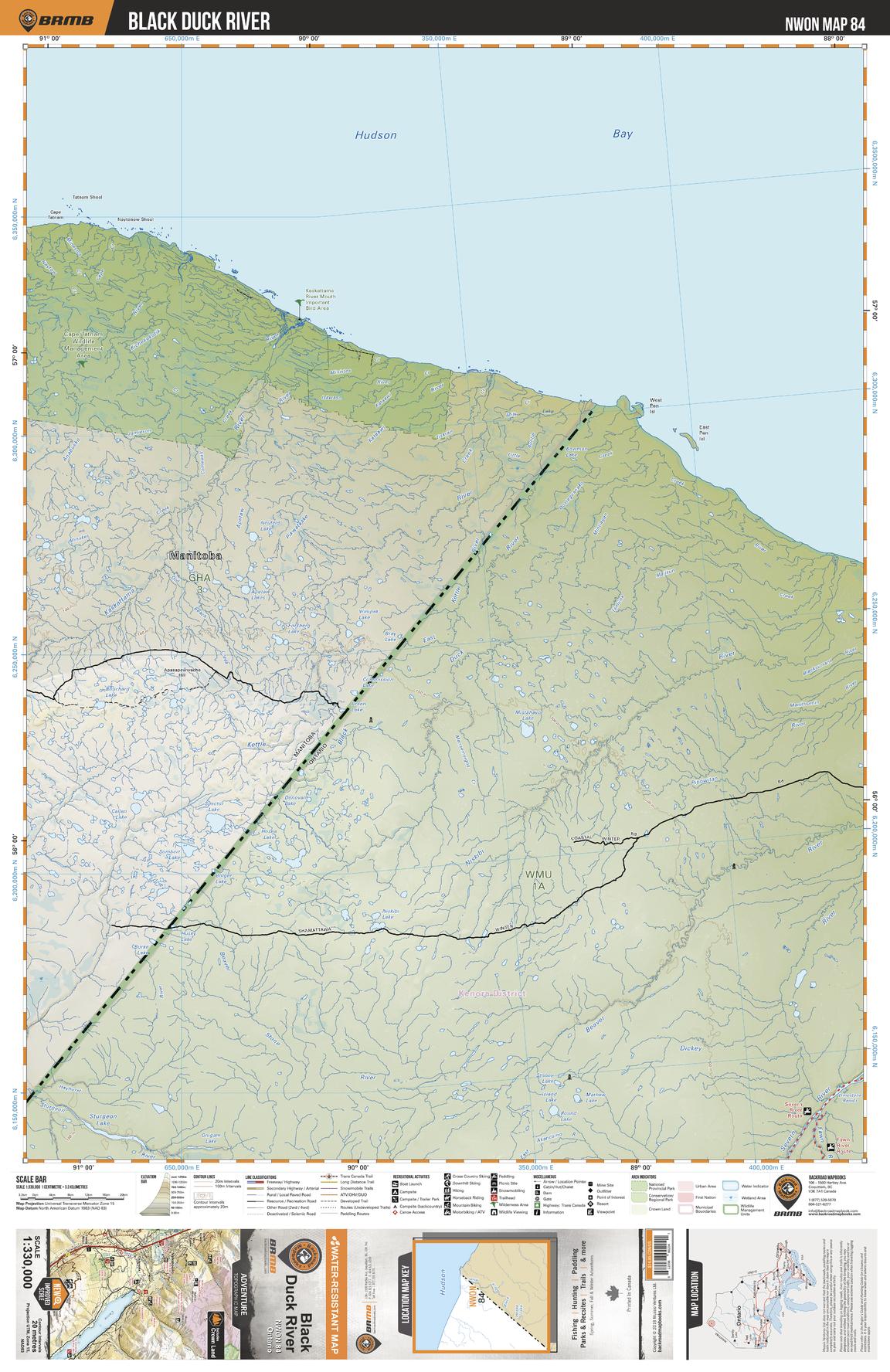 This recreation topographic map for Black Duck River highlights all the logging/resource roads, hunting areas, fishing lakes & streams, campsites, paddling routes for canoeing and kayaking, wildlife viewing areas, multi-use trails for hiking, biking, horseback riding, cross-country skiing and snowshoeing, motorized trails for ATVing and snowmobiling & more. Covering 48,670 km2 (18,790 mi2), this 1:330,000 scale map measures 191 x 254 km (119 x 158 mi), providing you with more topographic and recreational detail for the Sandy Lake area than any other map on the market. New features include expanded road and trail data and countless recreational Points of Interest. Included on this map are Black Duck River, Niskibi River, Beaver River, Severn River, Dickey River, Black Current River, Sturgeon Lake, Sturgeon River, Fawn River and more.