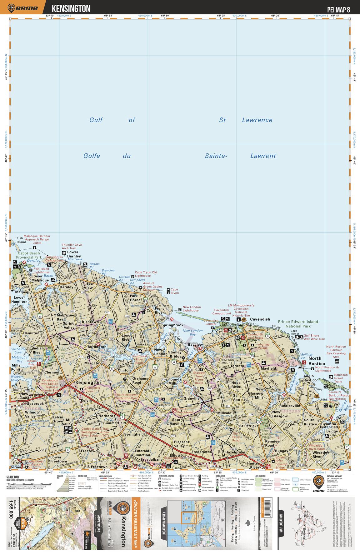 This recreation topographic map for Kensington highlights all the logging/resource roads, hunting areas, fishing lakes & streams, campsites, paddling routes for canoeing and kayaking, wildlife viewing areas, multi-use trails for hiking, biking, horseback riding, cross-country skiing and snowshoeing, motorized trails for ATVing and snowmobiling & more. Covering 1,950 km2 (750 mi2), this 1:65,000 scale map measures 38 x 51 km (23.5 x 32 mi), providing you with more topographic and recreational detail for the Grand Manan Island area than any other map on the market. New features include enhanced Crown land data and countless updates to roads, trails and recreational Points of Interest. This map includes Kensington, Prince Edward Island National Park, New London Bay, Stanley River, Malpeque Bay, Cabot Beach Provincial Park and more!