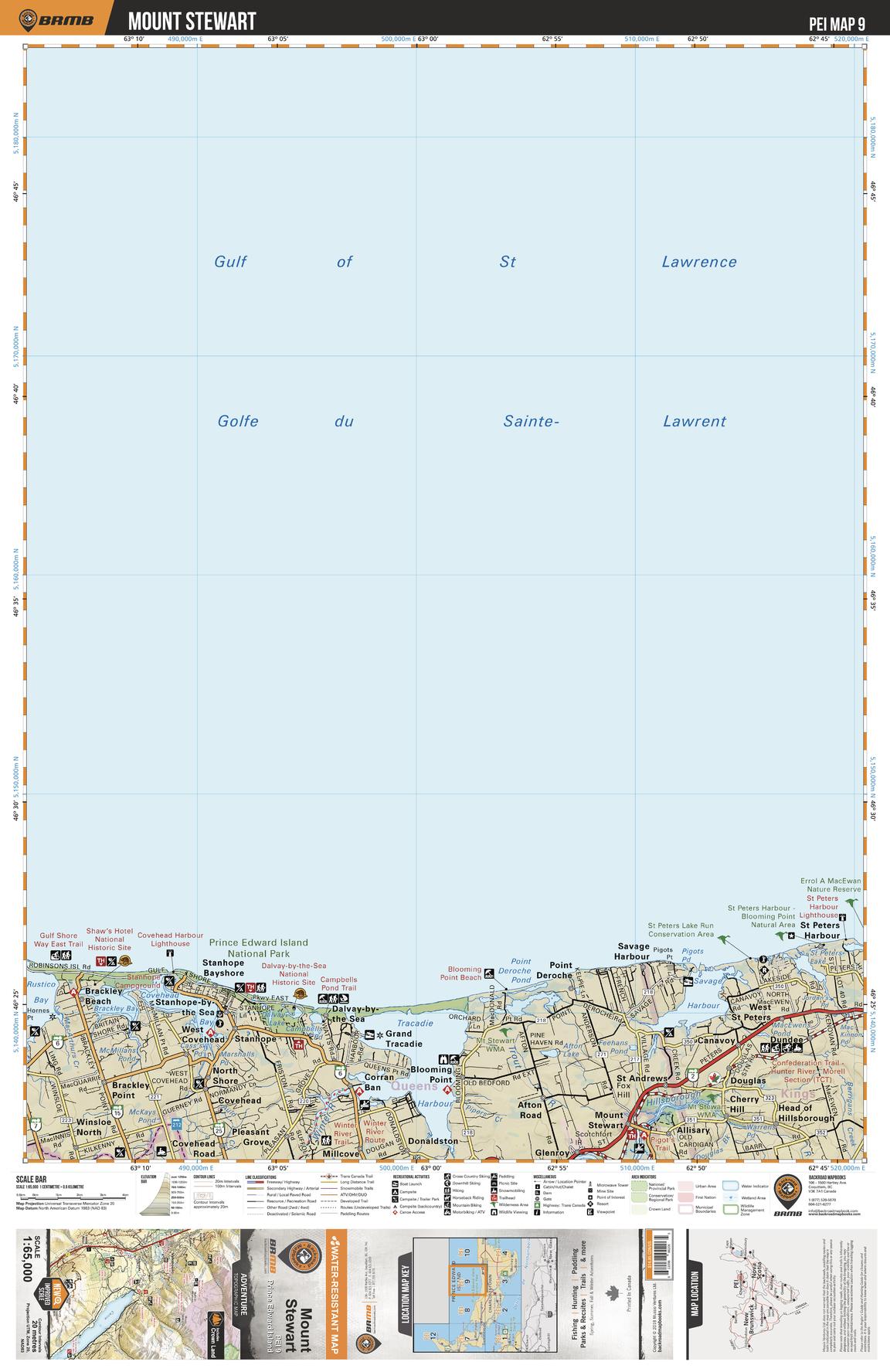This recreation topographic map for Mount Stewart highlights all the logging/resource roads, hunting areas, fishing lakes & streams, campsites, paddling routes for canoeing and kayaking, wildlife viewing areas, multi-use trails for hiking, biking, horseback riding, cross-country skiing and snowshoeing, motorized trails for ATVing and snowmobiling & more. Covering 1,950 km2 (750 mi2), this 1:65,000 scale map measures 38 x 51 km (23.5 x 32 mi), providing you with more topographic and recreational detail for the Grand Manan Island area than any other map on the market. New features include enhanced Crown land data and countless updates to roads, trails and recreational Points of Interest. This map includes Mount Stewart, Prince Edward Island National Park, Tracadie Harbour, Savage Harbour, Covehead Bay, Brackley Bay and more!