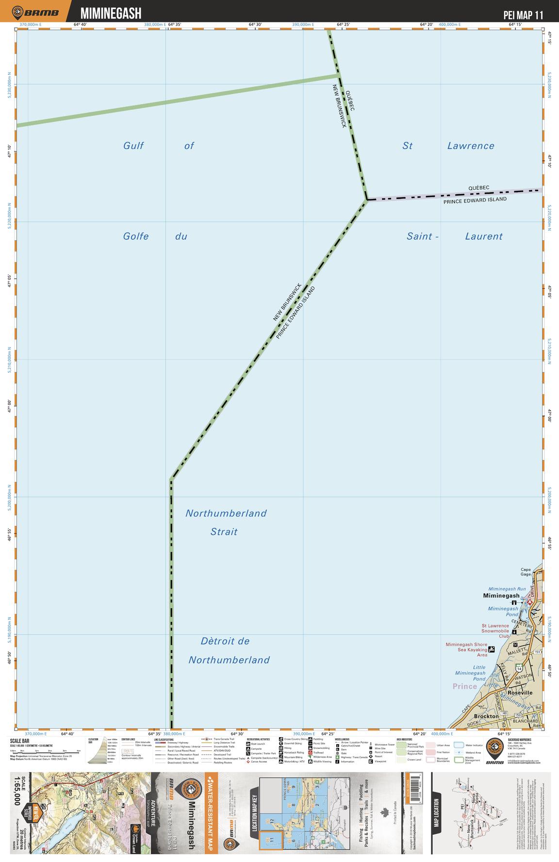 This recreation topographic map for Miminegash highlights all the logging/resource roads, hunting areas, fishing lakes & streams, campsites, paddling routes for canoeing and kayaking, wildlife viewing areas, multi-use trails for hiking, biking, horseback riding, cross-country skiing and snowshoeing, motorized trails for ATVing and snowmobiling & more. Covering 1,950 km2 (750 mi2), this 1:65,000 scale map measures 38 x 51 km (23.5 x 32 mi), providing you with more topographic and recreational detail for the Grand Manan Island area than any other map on the market. New features include enhanced Crown land data and countless updates to roads, trails and recreational Points of Interest. This map includes Miminegash, Miminegash Pond, Little Miminegash River, Roseville and more!