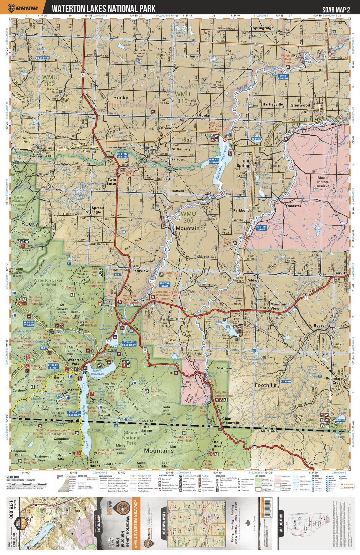 This recreation topographic map for the Waterton Lakes National Park area highlights all the logging and resource roads, multi-use trails for hikers, mountain bikers, horseback riders, cross-country skiers and snowshoers, motorized trails for ATVers and snowmobilers, fishing lakes and rivers, recreation areas, campgrounds, day-use areas, viewpoints, backcountry campsites, work camps, oil & gas sites, backcountry huts and cabins and more. No other map for the area provides you with this level of recreational or topographic detail. Covering 2,465 km2 (950 mi2) in total, this 1:75,000 scale map measures 43 x 57 km (27 x 35.5 mi). Special features include Crown Forest Management Areas, Public Land Use Zones, labelled fish species, enhanced oil & gas data and countless roads, trails and recreational Points of Interest. This map includes Waterton Reservoir, Waterton Lakes National Park, Blood Indian Reserve, Payne Lake, Beazer, Police Outpost Prov Park, Yarrow, Belly River, Waterton River, Glenwood and more!