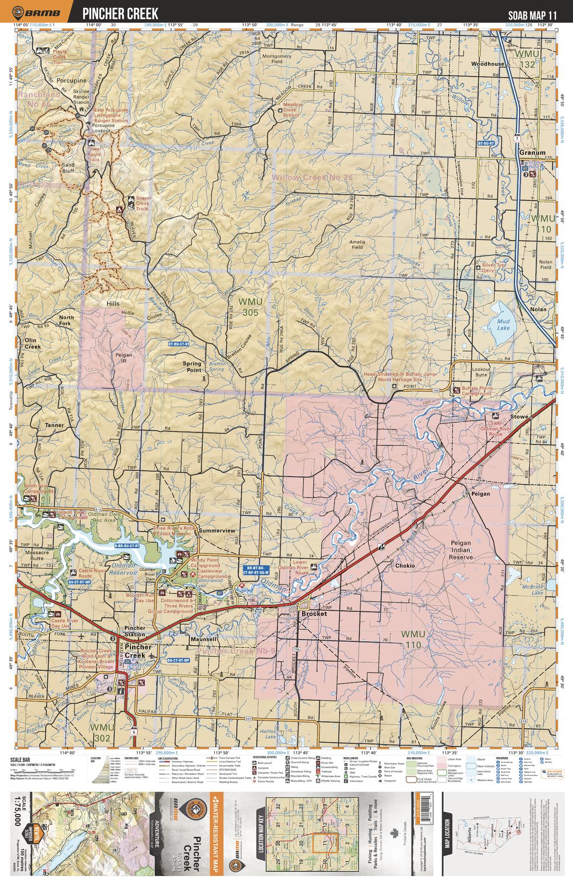 This recreation topographic map for the Pincher Creek area highlights all the logging and resource roads, multi-use trails for hikers, mountain bikers, horseback riders, cross-country skiers and snowshoers, motorized trails for ATVers and snowmobilers, fishing lakes and rivers, recreation areas, campgrounds, day-use areas, viewpoints, backcountry campsites, work camps, oil & gas sites, backcountry huts and cabins and more. No other map for the area provides you with this level of recreational or topographic detail. Covering 2,465 km2 (950 mi2) in total, this 1:75,000 scale map measures 43 x 57 km (27 x 35.5 mi). Special features include Crown Forest Management Areas, Public Land Use Zones, labelled fish species, enhanced oil & gas data and countless roads, trails and recreational Points of Interest. This map includes Mud Lake, Oldman River, Oldman River Reservoir, Brocket, Pincher Creek, Granum, Peigan Indian Reserve, Porcupine Hills, Willow Creek, Woodhouse and more!