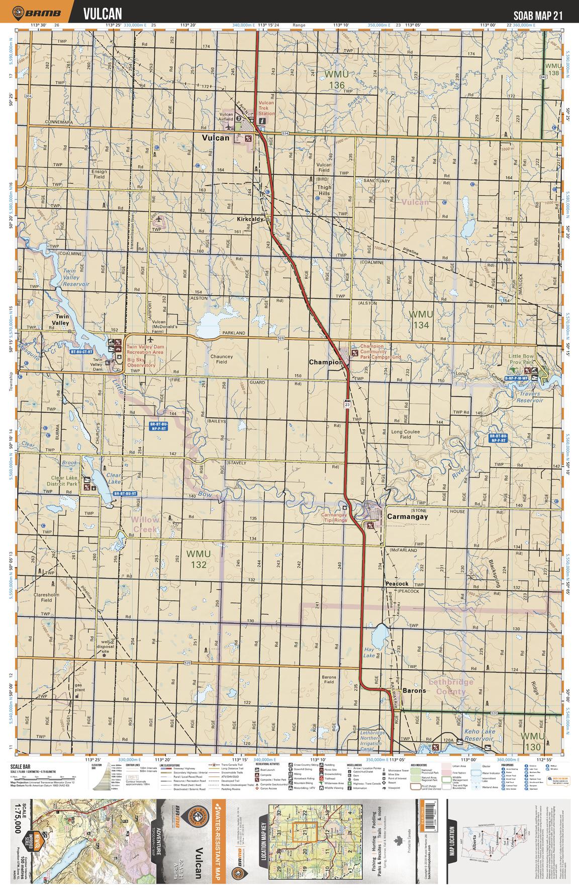This recreation topographic map for the Vulcan area highlights all the logging and resource roads, multi-use trails for hikers, mountain bikers, horseback riders, cross-country skiers and snowshoers, motorized trails for ATVers and snowmobilers, fishing lakes and rivers, recreation areas, campgrounds, day-use areas, viewpoints, backcountry campsites, work camps, oil & gas sites, backcountry huts and cabins and more. No other map for the area provides you with this level of recreational or topographic detail. Covering 2,465 km2 (950 mi2) in total, this 1:75,000 scale map measures 43 x 57 km (27 x 35.5 mi). Special features include Crown Forest Management Areas, Public Land Use Zones, labelled fish species, enhanced oil & gas data and countless roads, trails and recreational Points of Interest. This map includes Little Bow River, Vulcan, Clear Lake, Little Bow Prov Park, Travers Reservoir, Carmangay, Kirkcaldy, Champion, Barons, Hay Lake and more!