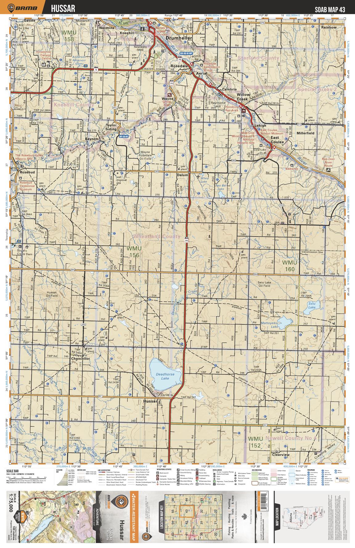This recreation topographic map for the Hussar area highlights all the logging and resource roads, multi-use trails for hikers, mountain bikers, horseback riders, cross-country skiers and snowshoers, motorized trails for ATVers and snowmobilers, fishing lakes and rivers, recreation areas, campgrounds, day-use areas, viewpoints, backcountry campsites, work camps, oil & gas sites, backcountry huts and cabins and more. No other map for the area provides you with this level of recreational or topographic detail. Covering 2,465 km2 (950 mi2) in total, this 1:75,000 scale map measures 43 x 57 km (27 x 35.5 mi). Special features include Crown Forest Management Areas, Public Land Use Zones, labelled fish species, enhanced oil & gas data and countless roads, trails and recreational Points of Interest. This map includes Drumheller, Red Deer River, Deadhorse Lake, Hussar, Mattoyekiu Lake, Seiu Lake, Rosebud River, Rosedale, East Coulee, Chancellor and more!