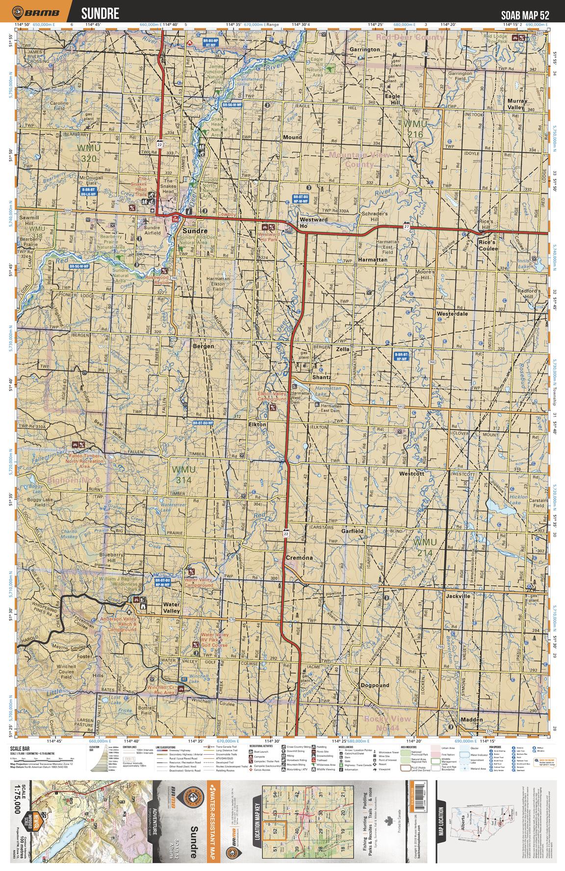 This recreation topographic map for the Sundre area highlights all the logging and resource roads, multi-use trails for hikers, mountain bikers, horseback riders, cross-country skiers and snowshoers, motorized trails for ATVers and snowmobilers, fishing lakes and rivers, recreation areas, campgrounds, day-use areas, viewpoints, backcountry campsites, work camps, oil & gas sites, backcountry huts and cabins and more. No other map for the area provides you with this level of recreational or topographic detail. Covering 2,465 km2 (950 mi2) in total, this 1:75,000 scale map measures 43 x 57 km (27 x 35.5 mi). Special features include Crown Forest Management Areas, Public Land Use Zones, labelled fish species, enhanced oil & gas data and countless roads, trails and recreational Points of Interest. This map includes Little Red Deer River, Sundre, Water Valley, Boggy Lake, Bergen, Westward Ho, Rice's Coulee, Hicklon Lake, Murray Valley, Red Deer River and more!