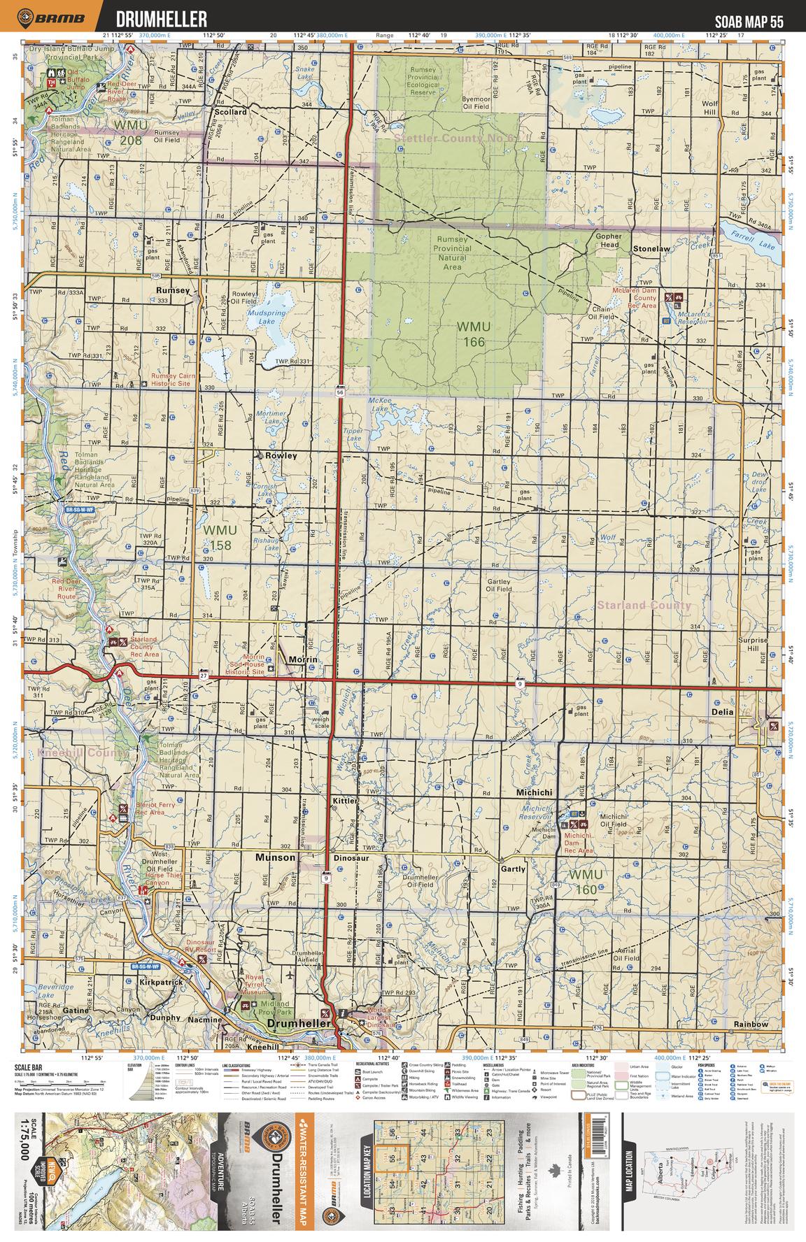 This recreation topographic map for the Drumheller area highlights all the logging and resource roads, multi-use trails for hikers, mountain bikers, horseback riders, cross-country skiers and snowshoers, motorized trails for ATVers and snowmobilers, fishing lakes and rivers, recreation areas, campgrounds, day-use areas, viewpoints, backcountry campsites, work camps, oil & gas sites, backcountry huts and cabins and more. No other map for the area provides you with this level of recreational or topographic detail. Covering 2,465 km2 (950 mi2) in total, this 1:75,000 scale map measures 43 x 57 km (27 x 35.5 mi). Special features include Crown Forest Management Areas, Public Land Use Zones, labelled fish species, enhanced oil & gas data and countless roads, trails and recreational Points of Interest. This map includes Rumsey Provincial Natural Area, Mudspring Lake, Morrin, Drumheller, Michichi, Delia, Munson, Farrell Lake, Red Deer River, Tolman Badlands Heritage Rangeland and more!