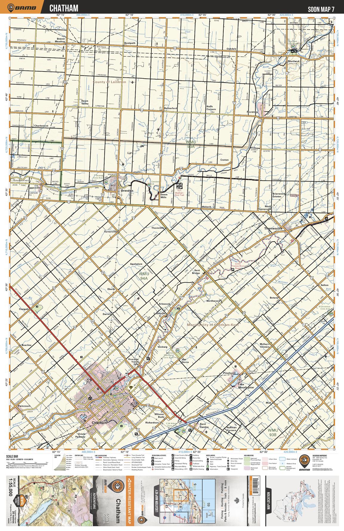 This recreation topographic map for Chatham highlights all the logging/resource roads, hunting areas, fishing lakes & streams, campsites, paddling routes for canoeing and kayaking, wildlife viewing areas, multi-use trails for hiking, biking, horseback riding, cross-country skiing and snowshoeing, motorized trails for ATVing and snowmobiling & more. Covering 1,325 km2 (510 mi2), this 1:55,000 scale map measures 31.5 x 42 km (19.5 x 26 mi), providing you with more topographic and recreational detail for the Detroit River area than any other map on the market. New features include expanded road and trail data and countless recreational Points of Interest. Included on this map are Chatham, Thames River, Sydenham River, Shetland, Thamesville, Dresden and more!