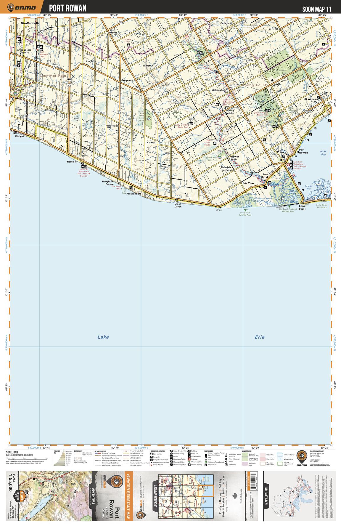 This recreation topographic map for Port Rowan highlights all the logging/resource roads, hunting areas, fishing lakes & streams, campsites, paddling routes for canoeing and kayaking, wildlife viewing areas, multi-use trails for hiking, biking, horseback riding, cross-country skiing and snowshoeing, motorized trails for ATVing and snowmobiling & more. Covering 1,325 km2 (510 mi2), this 1:55,000 scale map measures 31.5 x 42 km (19.5 x 26 mi), providing you with more topographic and recreational detail for the Detroit River area than any other map on the market. New features include expanded road and trail data and countless recreational Points of Interest. Included on this map are Port Rowan, Lake Erie, Inner Bay, Lee Brown Wildlife Area, Big Creek National Wildlife Area, Long Point Provincial Park and more!