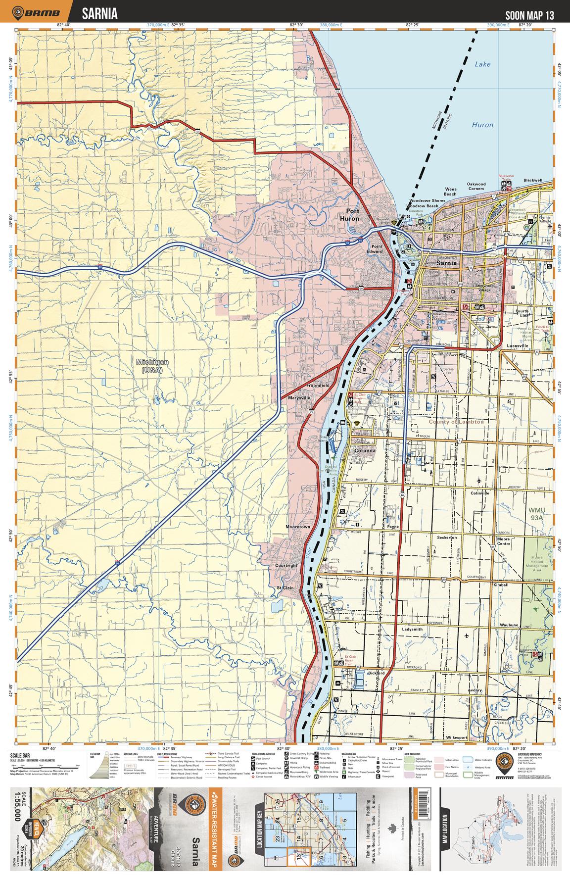 This recreation topographic map for Sarnia highlights all the logging/resource roads, hunting areas, fishing lakes & streams, campsites, paddling routes for canoeing and kayaking, wildlife viewing areas, multi-use trails for hiking, biking, horseback riding, cross-country skiing and snowshoeing, motorized trails for ATVing and snowmobiling & more. Covering 1,325 km2 (510 mi2), this 1:55,000 scale map measures 31.5 x 42 km (19.5 x 26 mi), providing you with more topographic and recreational detail for the Detroit River area than any other map on the market. New features include expanded road and trail data and countless recreational Points of Interest. Included on this map are Sarnia, Lake Huron, St Clair River, Port Huron, Canatara Park, Stag Island Provincial Wildlife Area, Woodrowe Shores, Point Edward and more!