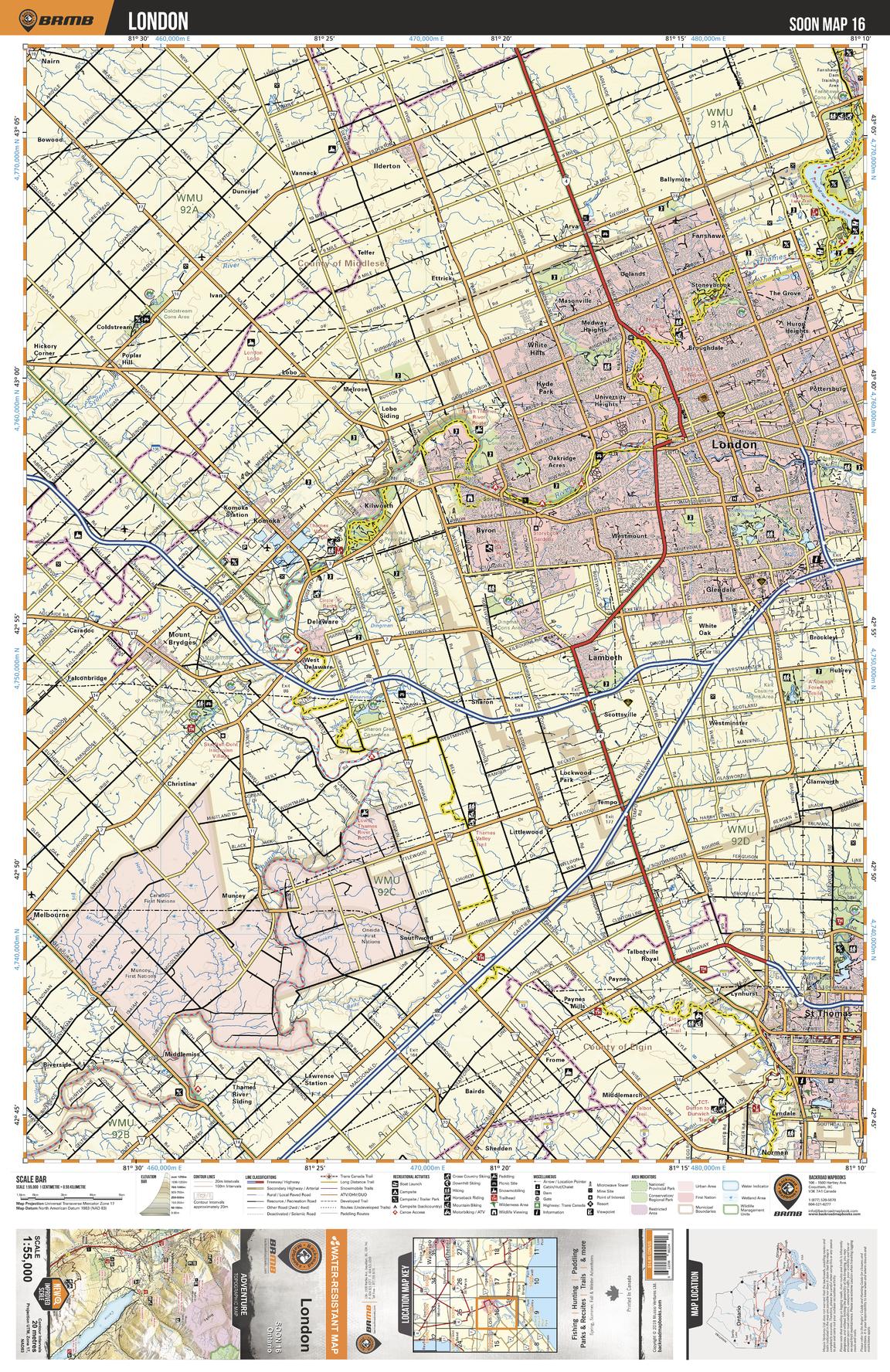 This recreation topographic map for London highlights all the logging/resource roads, hunting areas, fishing lakes & streams, campsites, paddling routes for canoeing and kayaking, wildlife viewing areas, multi-use trails for hiking, biking, horseback riding, cross-country skiing and snowshoeing, motorized trails for ATVing and snowmobiling & more. Covering 1,325 km2 (510 mi2), this 1:55,000 scale map measures 31.5 x 42 km (19.5 x 26 mi), providing you with more topographic and recreational detail for the Detroit River area than any other map on the market. New features include expanded road and trail data and countless recreational Points of Interest. Included on this map are London, St Thomas, Thames River, Medway Valley Natural Area, Sifton Bog Conservation Area, Komoka Provincial Park, Pinafore Park and more!