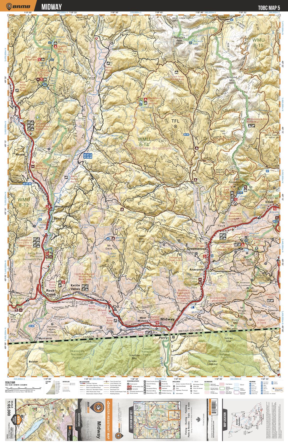 This recreation topographic map for the Midway area highlights all the logging roads, trails and recreational Points of Interest including hunting, camping, hiking, mountain biking, canoeing, kayaking, backcountry skiing, snowshoeing, cross-country skiing, wildlife viewing, ATVing, snowmobiling and more. No other map for the area provides you with this level of recreational or topographic detail. Special features include private land and countless roads, trails and recreational Points of Interest. Covering 1,950 km2 (750 mi2) in total, this 1:65,000 scale map measures 38 x 51 km (23.5 x 32 mi) and includes Midway, Kettle River, Boundary Creek Provincial Park, Greenwood, Rock Creek, Kettle Valley and more!