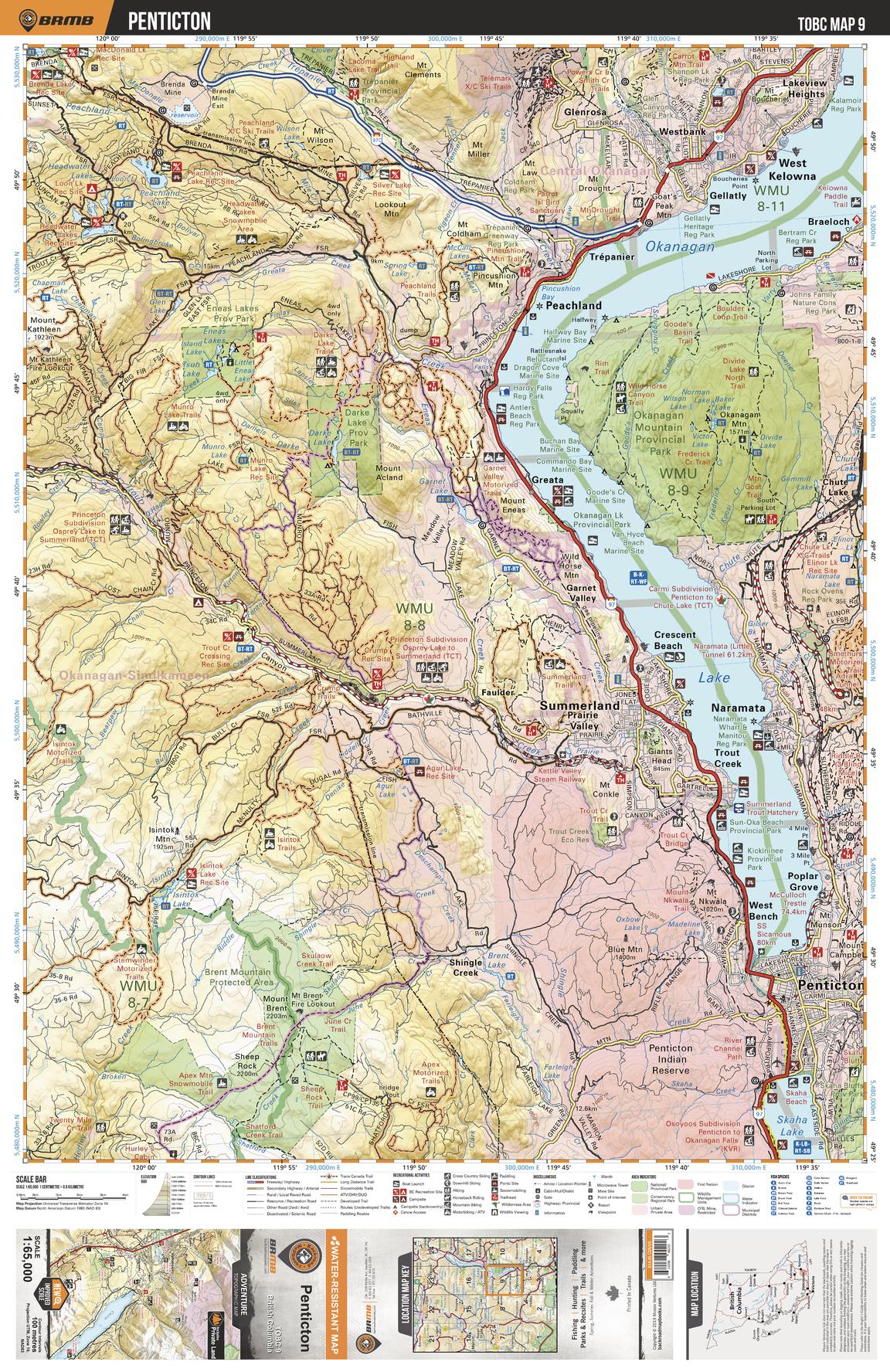 This recreation topographic map for the Penticton area highlights all the logging roads, trails and recreational Points of Interest including hunting, camping, hiking, mountain biking, canoeing, kayaking, backcountry skiing, snowshoeing, cross-country skiing, wildlife viewing, ATVing, snowmobiling and more. No other map for the area provides you with this level of recreational or topographic detail. Special features include private land and countless roads, trails and recreational Points of Interest. Covering 1,950 km2 (750 mi2) in total, this 1:65,000 scale map measures 38 x 51 km (23.5 x 32 mi) and includes Penticton, Okanagan Mountain Provincial Park, Darke Lake Provincial Park, Eneas Lake Provincial Park, Okanagan Lake, Skaha Lake and more!