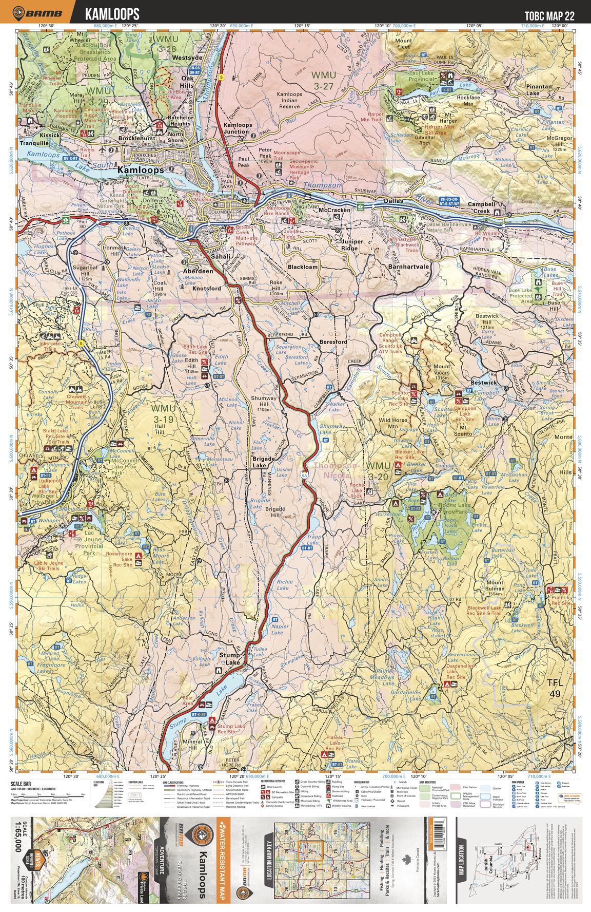 This recreation topographic map for the Kamloops area highlights all the logging roads, trails and recreational Points of Interest including hunting, camping, hiking, mountain biking, canoeing, kayaking, backcountry skiing, snowshoeing, cross-country skiing, wildlife viewing, ATVing, snowmobiling and more. No other map for the area provides you with this level of recreational or topographic detail. Special features include private land and countless roads, trails and recreational Points of Interest. Covering 1,950 km2 (750 mi2) in total, this 1:65,000 scale map measures 38 x 51 km (23.5 x 32 mi) and includes Kamloops, Paul Lake Provincial Park, Thompson River, Roche Lake Provincial Park, Lac le Jeune Provincial Park and more!